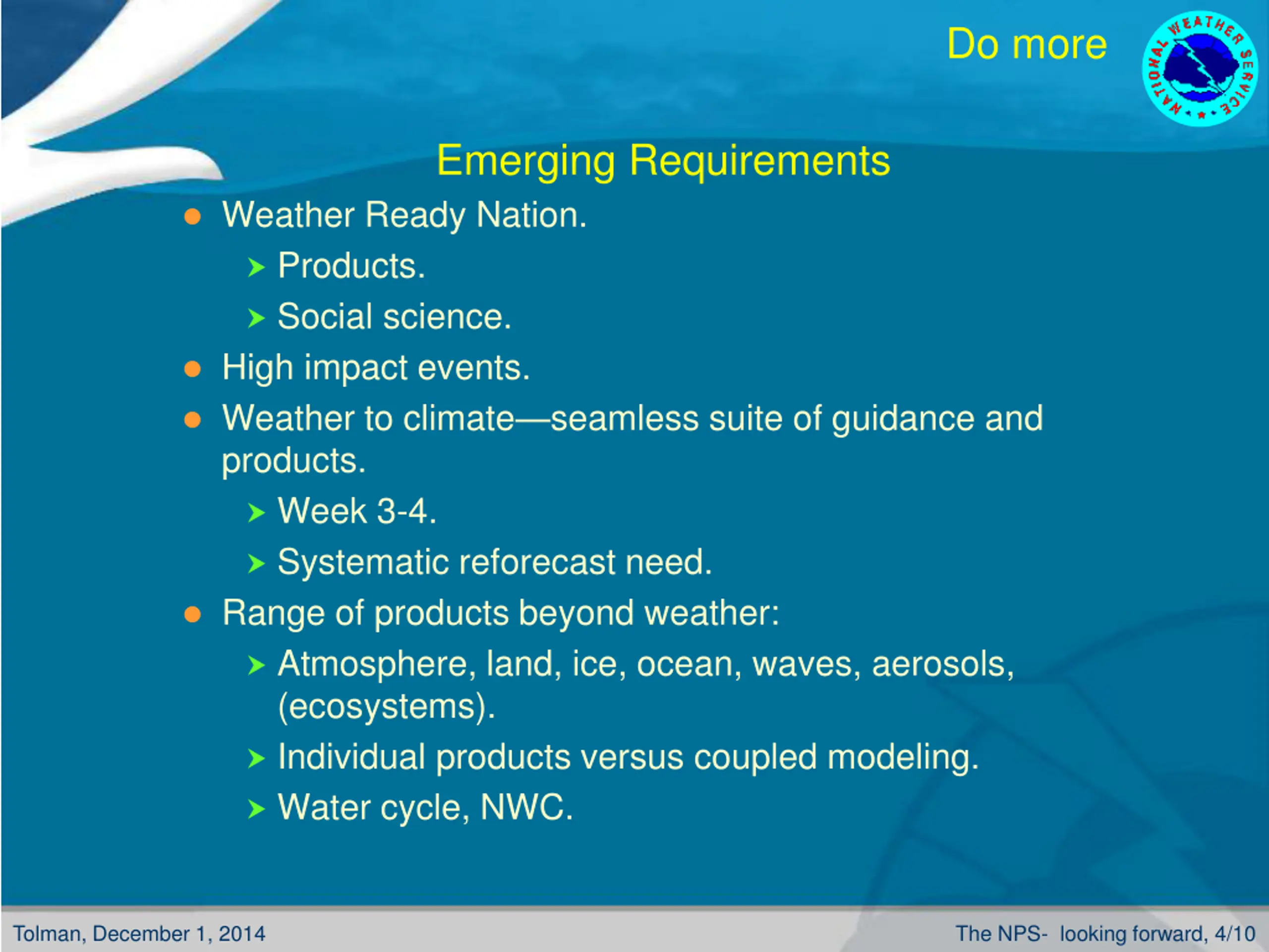 Do more Emerging Requirements Weather Ready Nation. Products. Social science. High impact events. Weather to climate seamless suite of guidance and products. Week 3-4. Systematic reforecast need. Range of products beyond weather: Atmosphere, land, ice, ocean, waves, aerosols, (ecosystems). Individual products versus coupled modeling. Water cycle, NWC. Tolman, December 1, 2014 The NPS- looking forward, 4/10