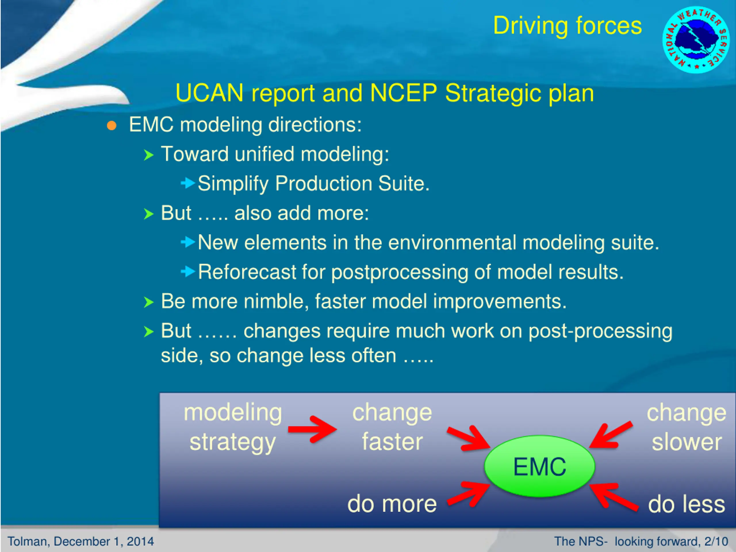 Driving forces UCAN report and NCEP Strategic plan EMC modeling directions: Toward unified modeling: Simplify Production Suite. But .. also add more: New elements in the environmental modeling suite. Reforecast for postprocessing of model results. Be more nimble, faster model improvements. But changes require much work on post-processing side, so change less often .. modeling strategy change faster change slower EMC do more do less Tolman, December 1, 2014 The NPS- looking forward, 2/10