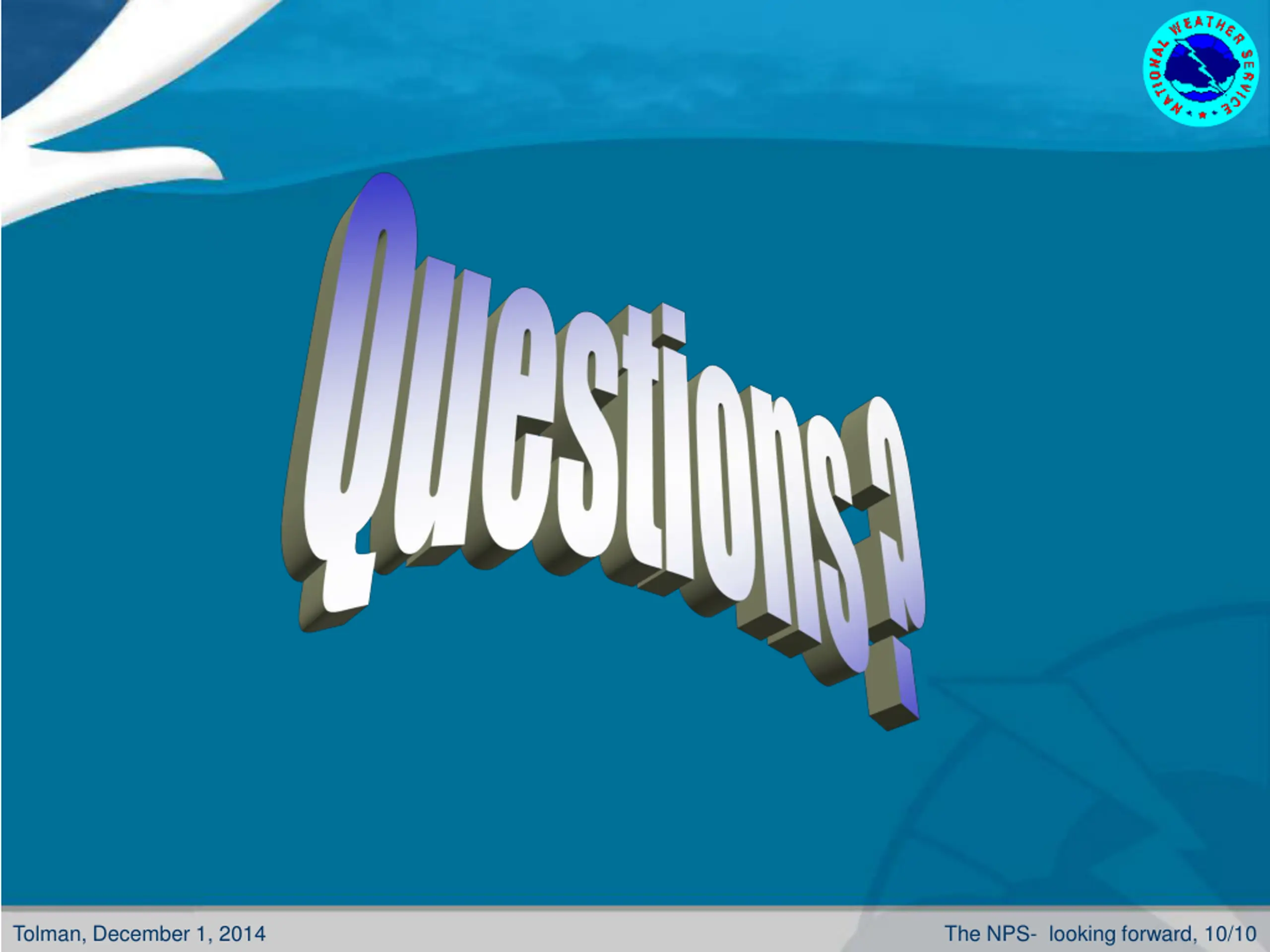 The NOAA Modeling Strategy Focus on probabilistic modeling (ensembles). Continue to pursue multi-model approach to ensembles. Limited within NCEP. National or international approach. Don t forget: ensemble systems only as good as the modeling system it is built from. Presentation / use of probabilistic information. Push to products for week 3-4. Unified modeling approach promoted by UCAN. * UCAR Community Advisory Committee for NCEP Tolman, December 1, 2014 The NPS- looking forward, 8/10