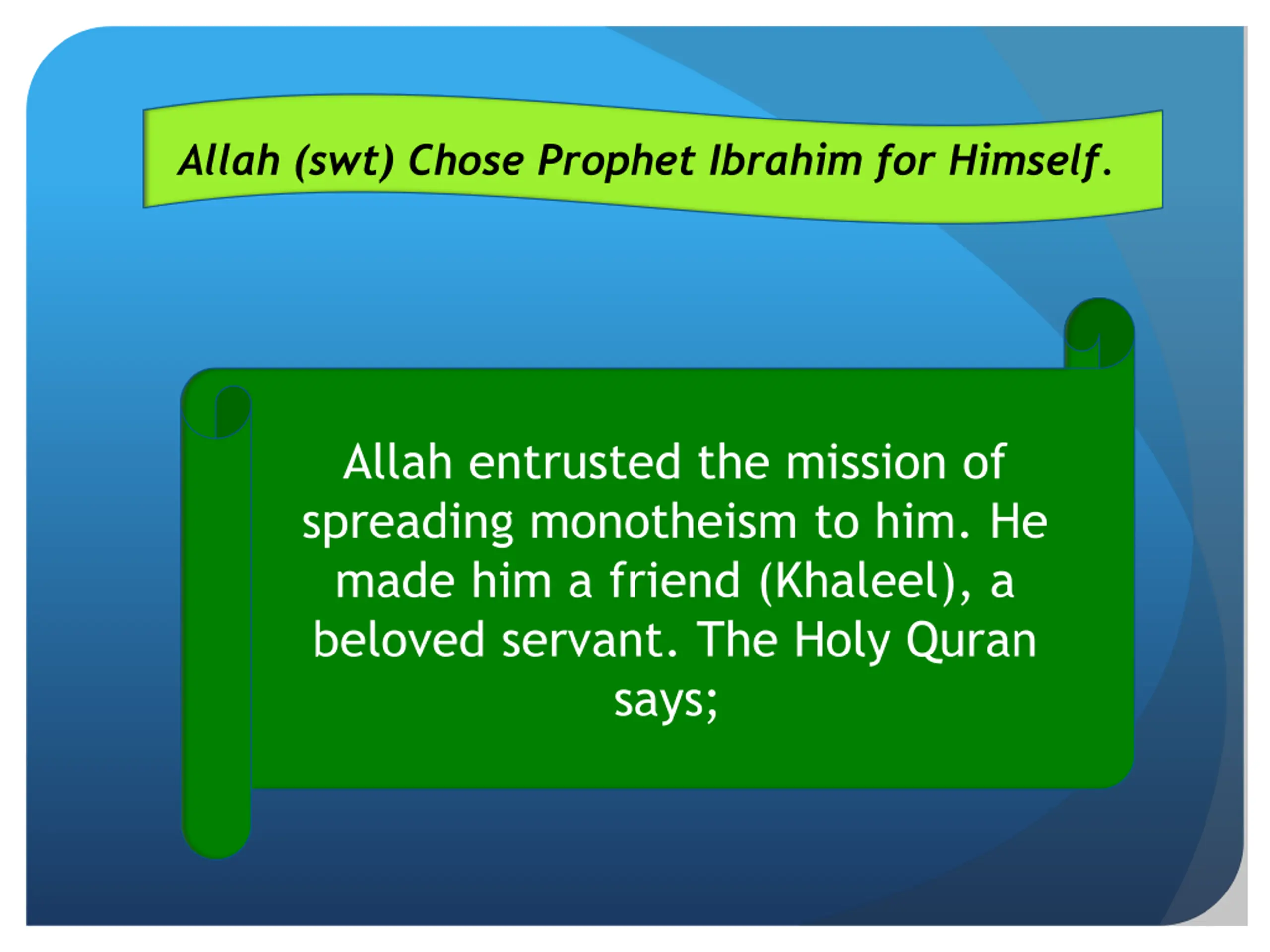 Allah (swt) Chose Prophet Ibrahim for Himself. Allah entrusted the mission of spreading monotheism to him. He made him a friend (Khaleel), a beloved servant. The Holy Quran says;
