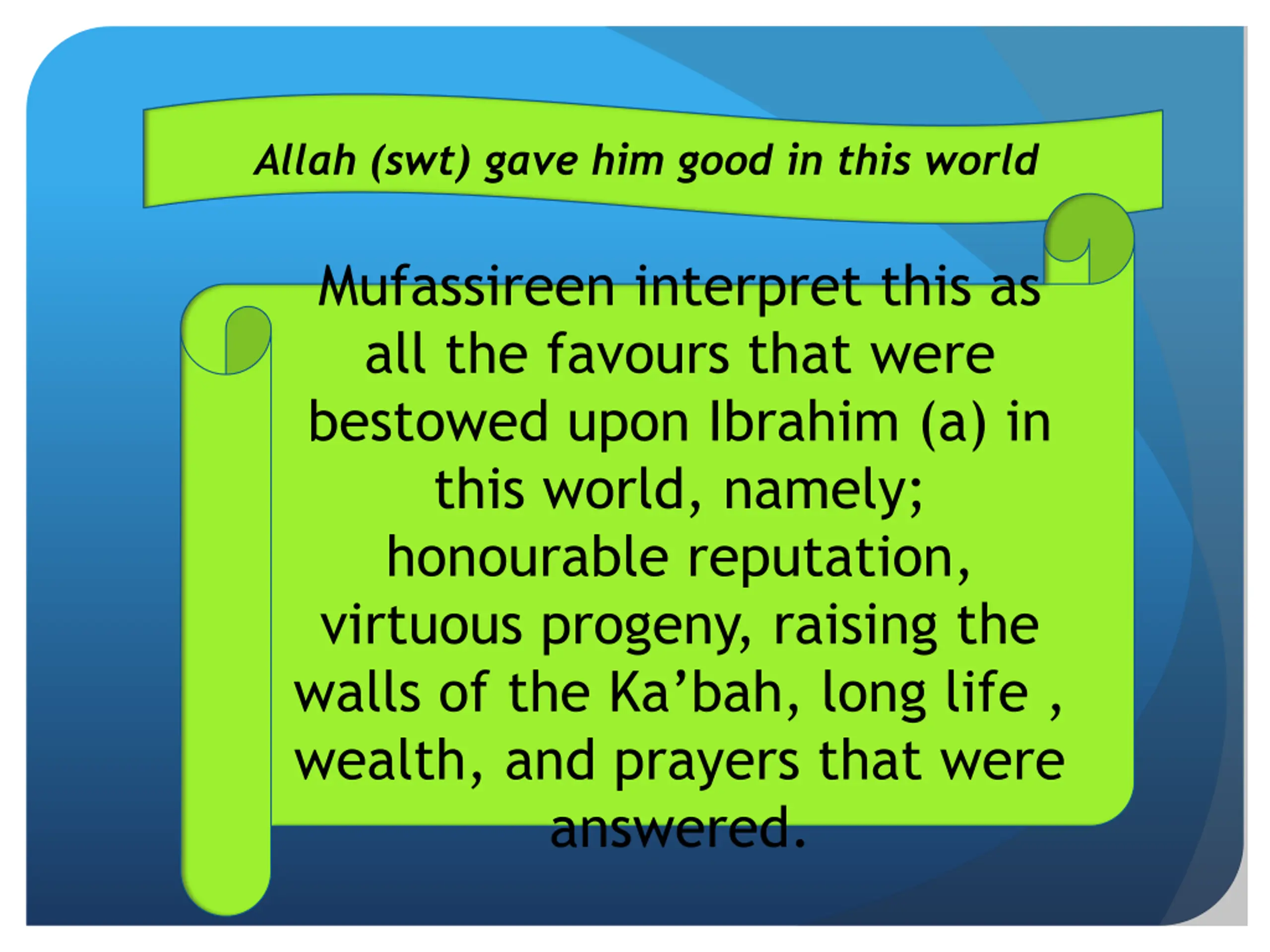Allah (swt) gave him good in this world Mufassireen interpret this as all the favours that were bestowed upon Ibrahim (a) in this world, namely; honourable reputation, virtuous progeny, raising the walls of the Ka bah, long life , wealth, and prayers that were answered.