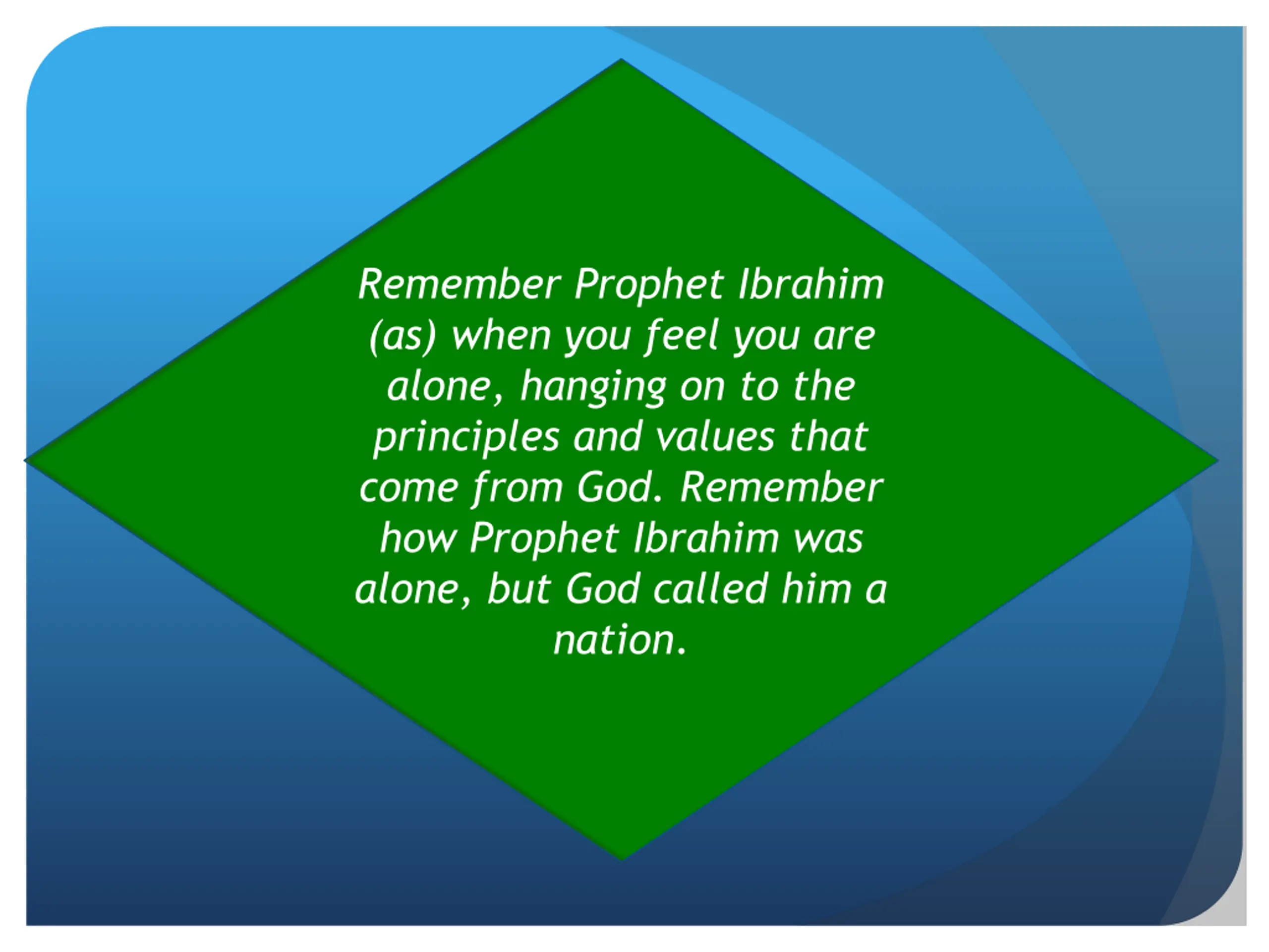 Remember Prophet Ibrahim (as) when you feel you are alone, hanging on to the principles and values that come from God. Remember how Prophet Ibrahim was alone, but God called him a nation.