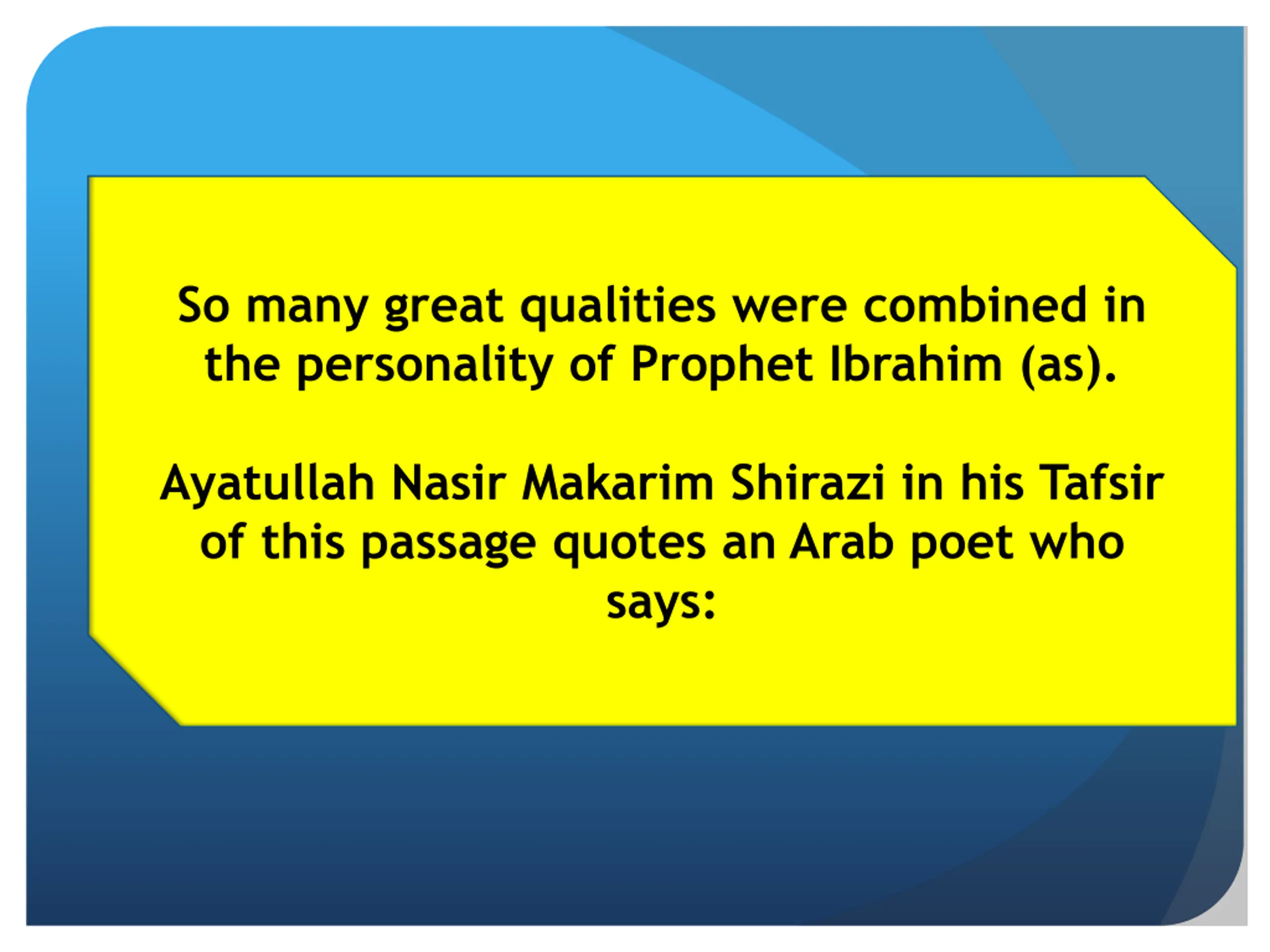 So many great qualities were combined in the personality of Prophet Ibrahim (as). Ayatullah Nasir Makarim Shirazi in his Tafsir of this passage quotes an Arab poet who says: