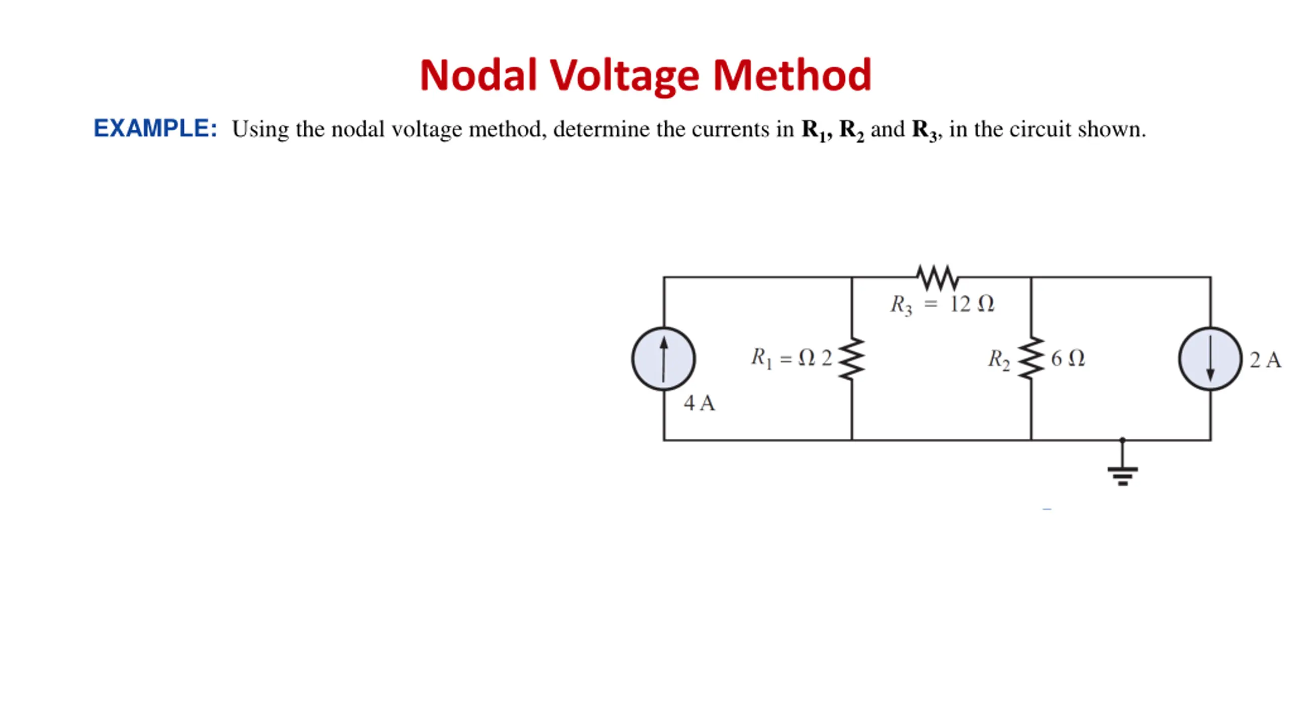 Nodal Voltage Method EXAMPLE: Using the nodal voltage method, determine the currents in R1, R2and R3, in the circuit shown.
