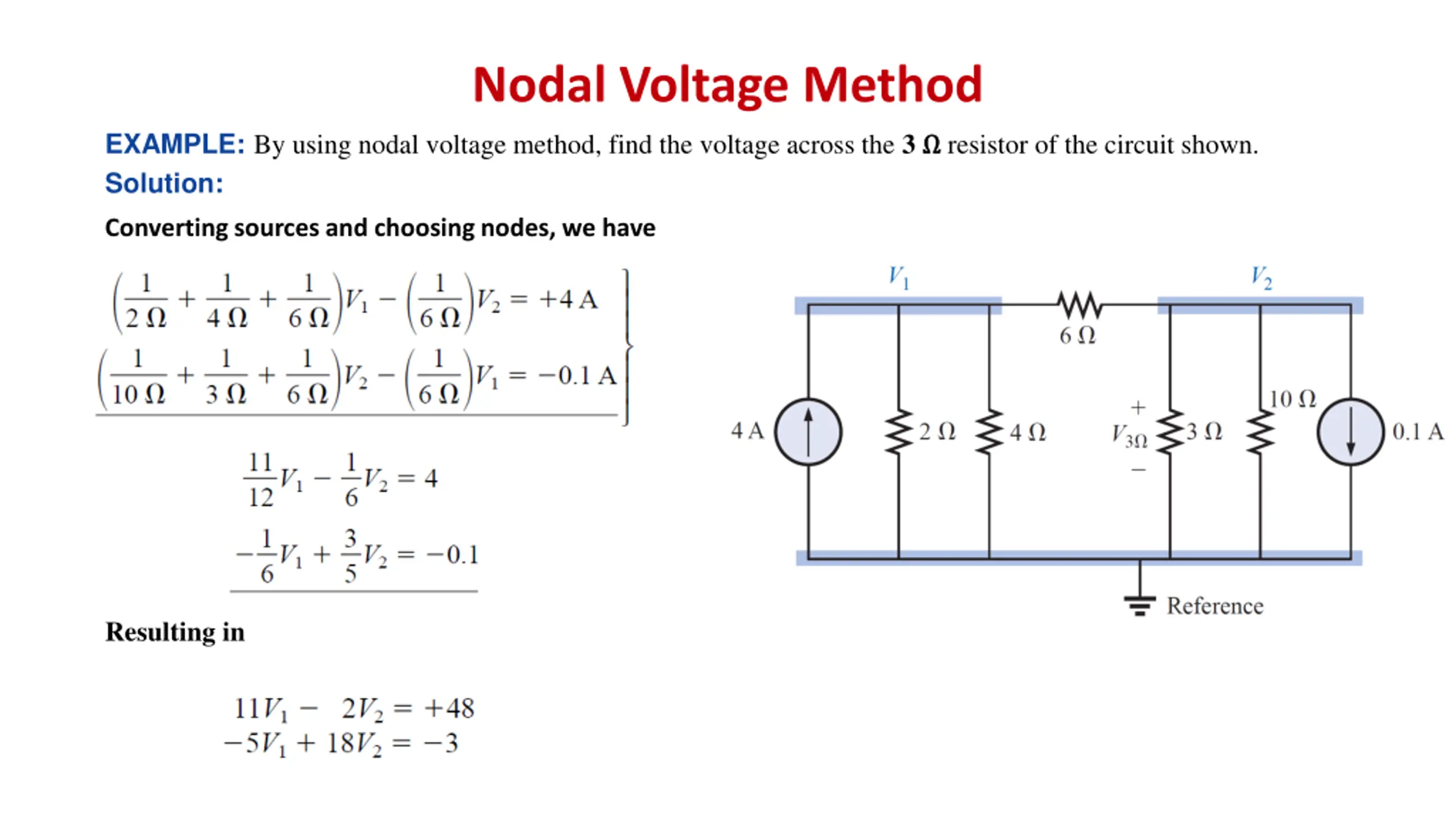 Nodal Voltage Method EXAMPLE: By using nodal voltage method, find the voltage across the 3 resistor of the circuit shown. Solution: Converting sources and choosing nodes, we have Resulting in