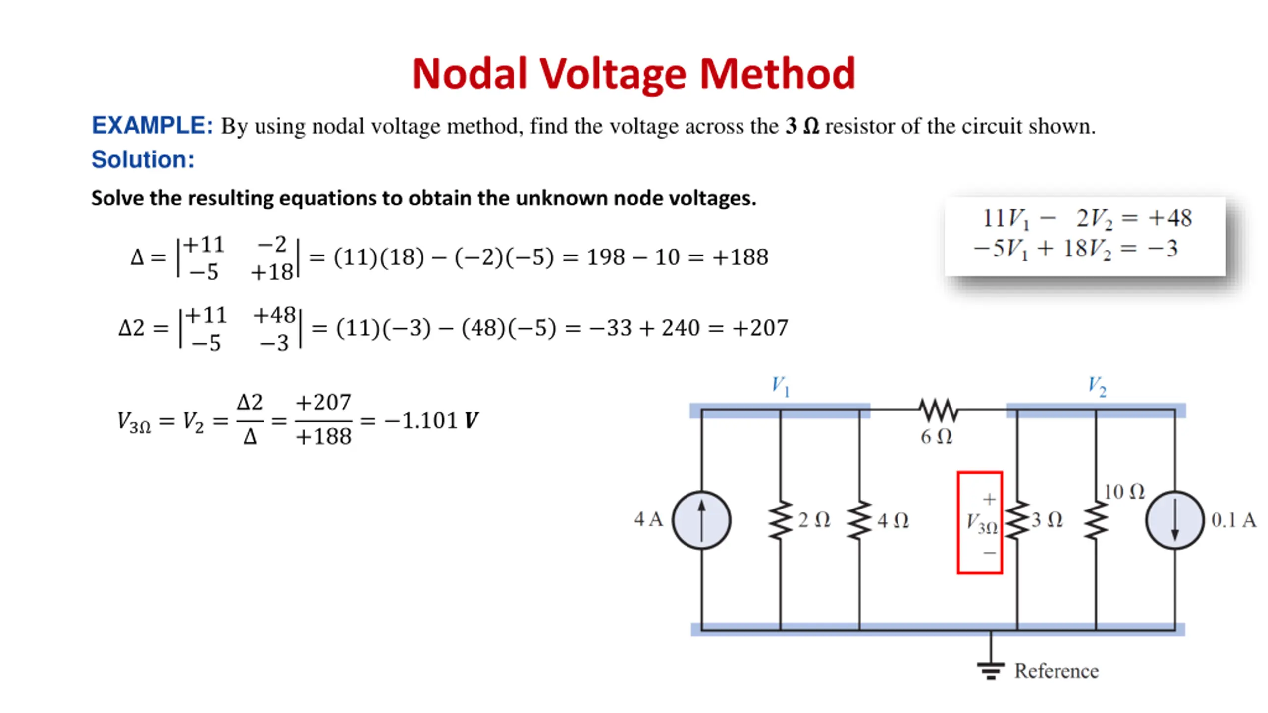 Nodal Voltage Method EXAMPLE: By using nodal voltage method, find the voltage across the 3 resistor of the circuit shown. Solution: Solve the resulting equations to obtain the unknown node voltages. =+11 2 +18= 11)(18 2 5 = 198 10 = +188 5 2 =+11 +48 3 = 11)( 3 48 5 = 33 + 240 = +207 5 ?3 = ?2= 2 =+207 +188= 1.101 ?
