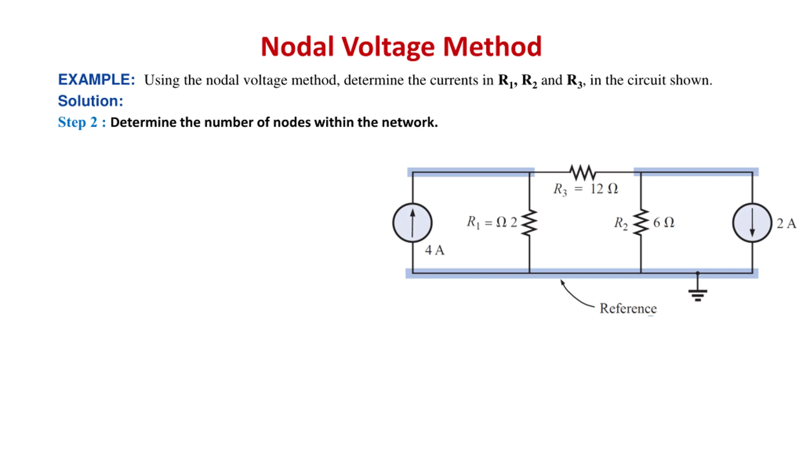 Nodal Voltage Method EXAMPLE: Using the nodal voltage method, determine the currents in R1, R2and R3, in the circuit shown. Solution: Step 2 : Determine the number of nodes within the network.