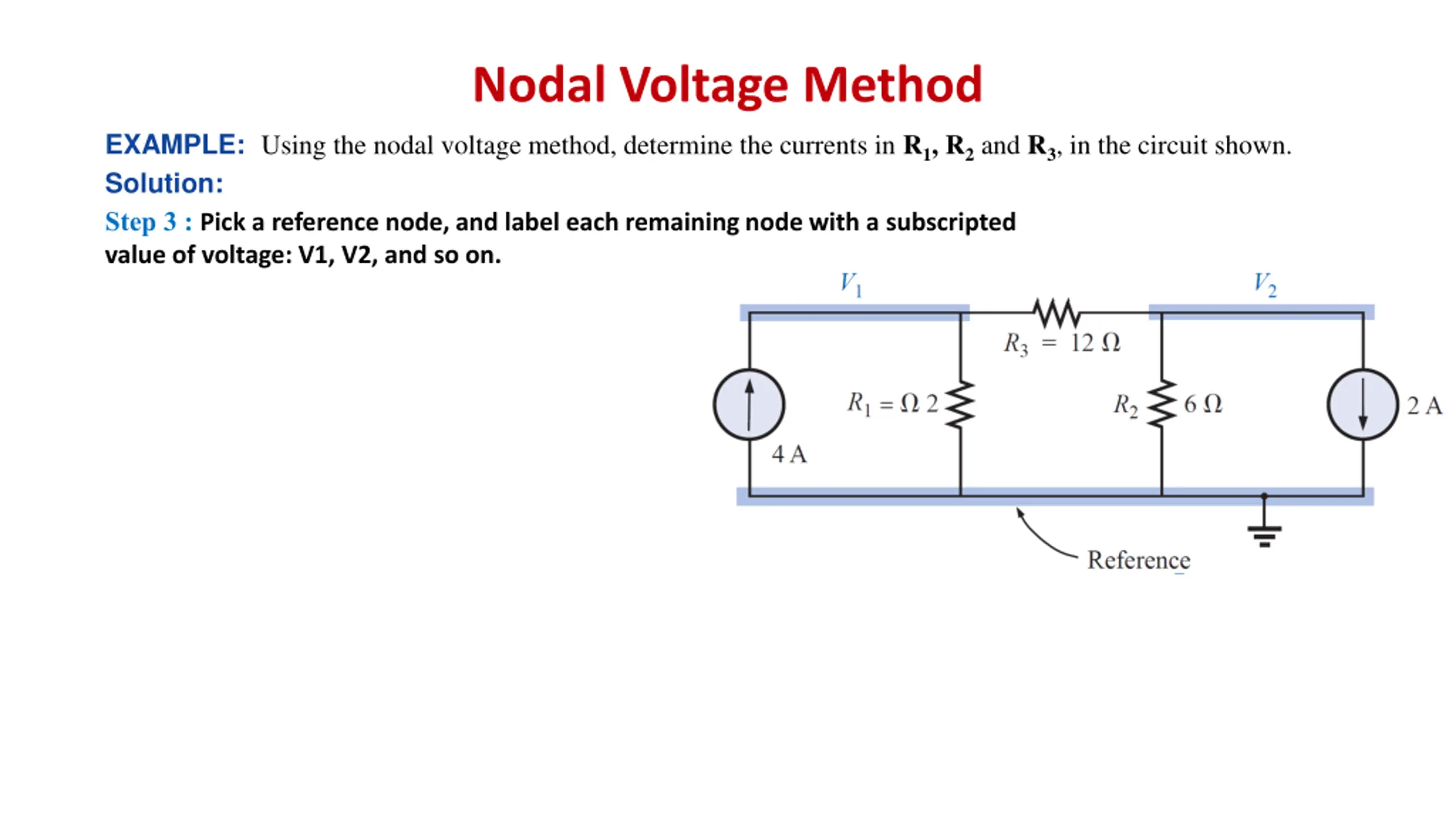 Nodal Voltage Method EXAMPLE: Using the nodal voltage method, determine the currents in R1, R2and R3, in the circuit shown. Solution: Step 3 : Pick a reference node, and label each remaining node with a subscripted value of voltage: V1, V2, and so on.