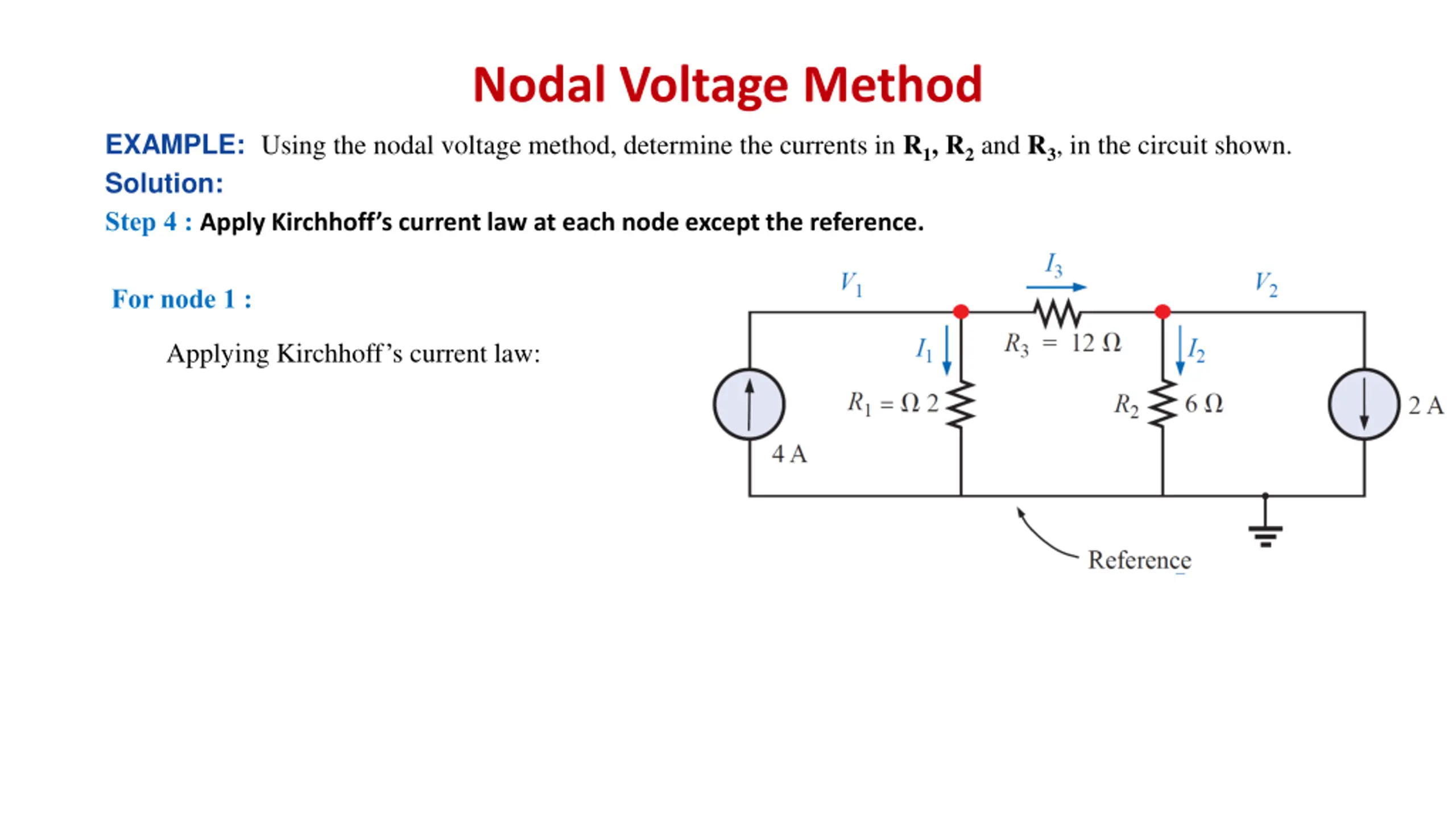 Nodal Voltage Method EXAMPLE: Using the nodal voltage method, determine the currents in R1, R2and R3, in the circuit shown. Solution: Step 4 : Apply Kirchhoff s current law at each node except the reference. For node 1 : Applying Kirchhoff s current law: