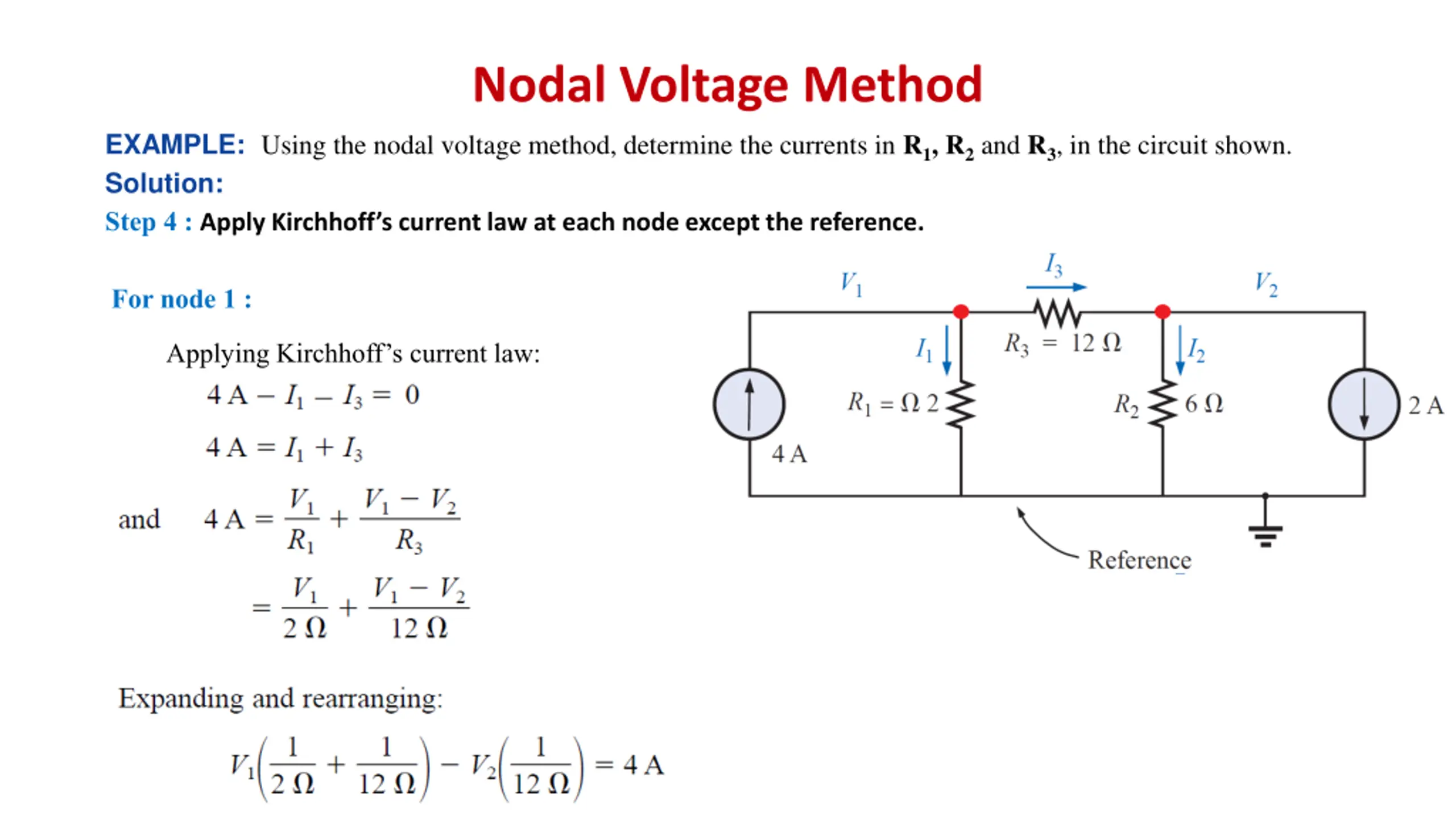 Nodal Voltage Method EXAMPLE: Using the nodal voltage method, determine the currents in R1, R2and R3, in the circuit shown. Solution: Step 4 : Apply Kirchhoff s current law at each node except the reference. For node 2 : Applying Kirchhoff s current law: