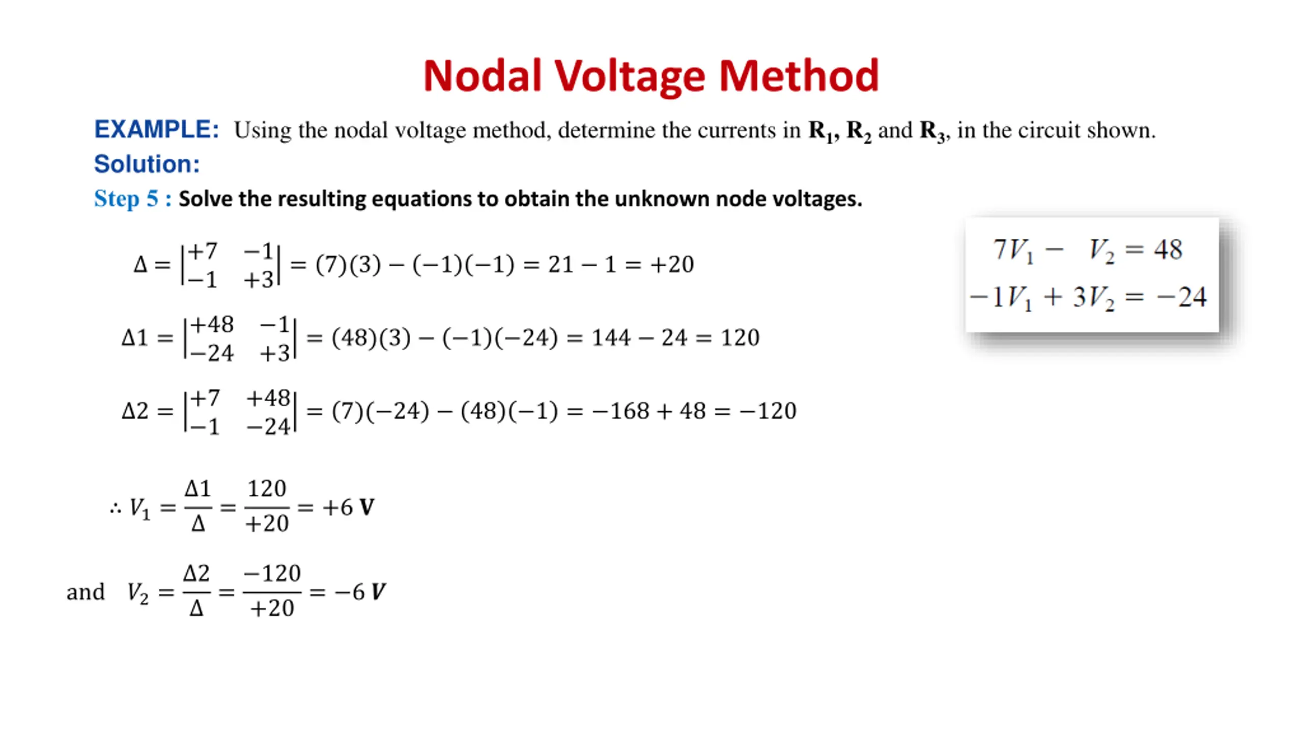 Nodal Voltage Method EXAMPLE: Using the nodal voltage method, determine the currents in R1, R2and R3, in the circuit shown. Solution: Step 5 : Solve the resulting equations to obtain the unknown node voltages. producing