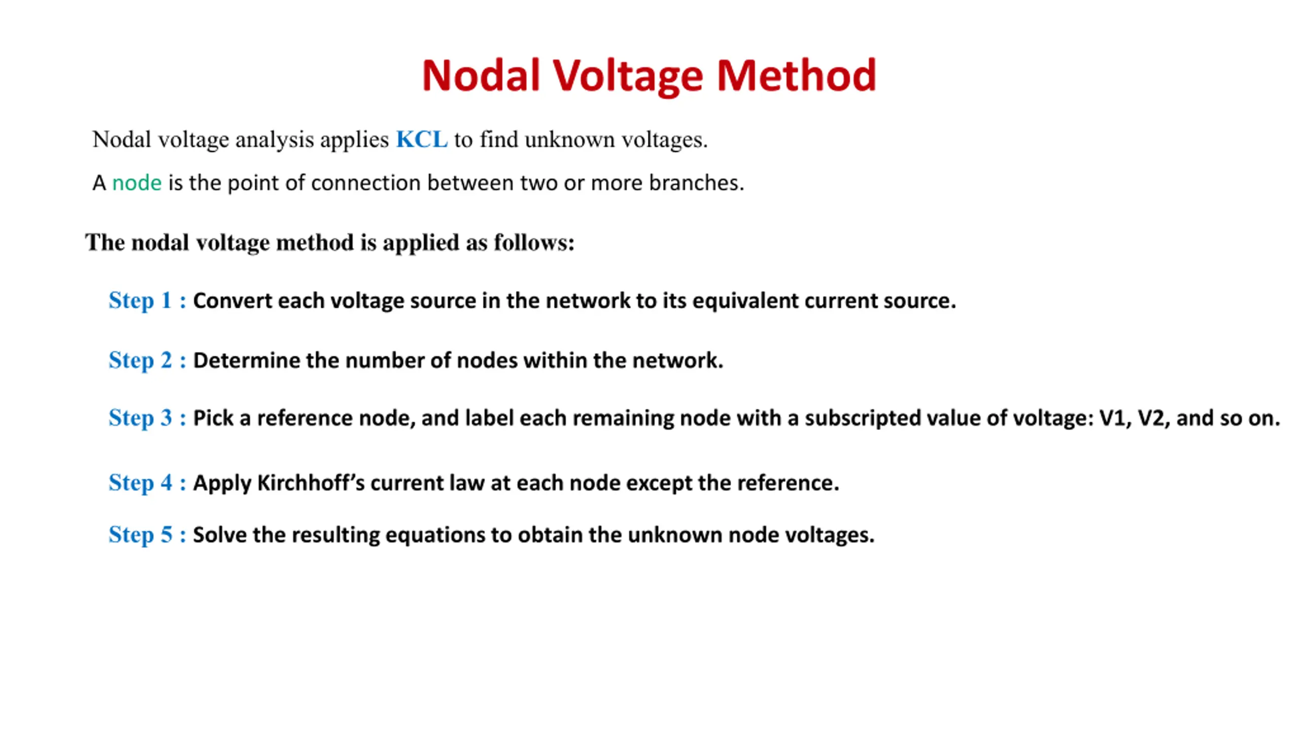 Nodal Voltage Method Nodal voltage analysis applies KCL to find unknown voltages. A node is the point of connection between two or more branches. The nodal voltage method is applied as follows: Step 1 : Convert each voltage source in the network to its equivalent current source. Step 2 : Determine the number of nodes within the network. Step 3 : Pick a reference node, and label each remaining node with a subscripted value of voltage: V1, V2, and so on. Step 4 : Apply Kirchhoff s current law at each node except the reference. Step 5 : Solve the resulting equations to obtain the unknown node voltages.