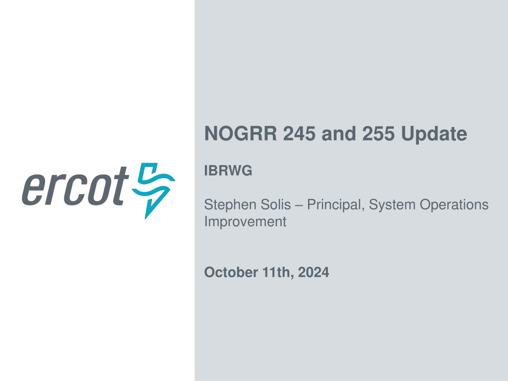 NOGRR 245 and 255 Update IBRWG Stephen Solis Principal, System Operations Improvement October 11th, 2024