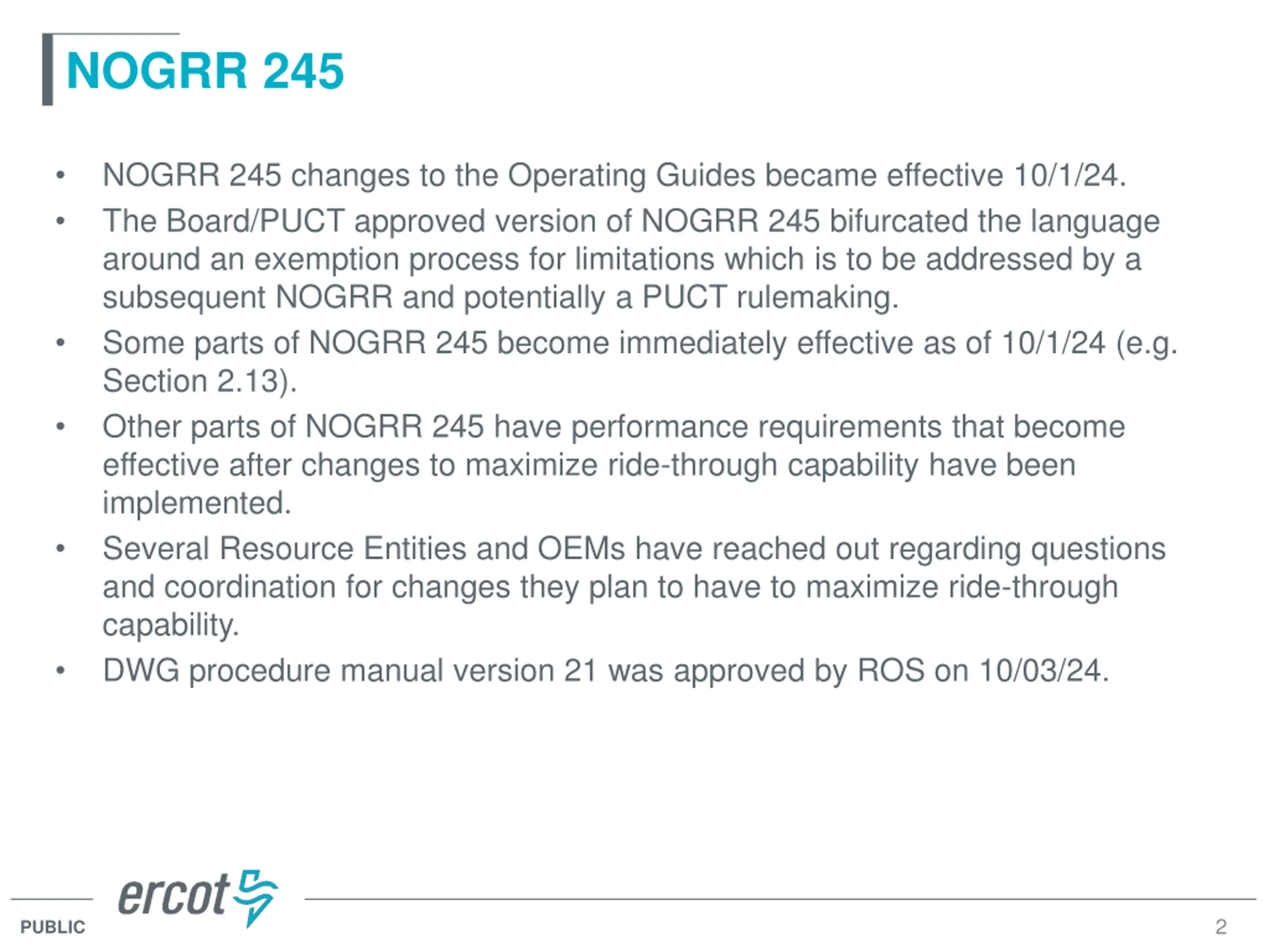 NOGRR 245 NOGRR 245 changes to the Operating Guides became effective 10/1/24. The Board/PUCT approved version of NOGRR 245 bifurcated the language around an exemption process for limitations which is to be addressed by a subsequent NOGRR and potentially a PUCT rulemaking. Some parts of NOGRR 245 become immediately effective as of 10/1/24 (e.g. Section 2.13). Other parts of NOGRR 245 have performance requirements that become effective after changes to maximize ride-through capability have been implemented. Several Resource Entities and OEMs have reached out regarding questions and coordination for changes they plan to have to maximize ride-through capability. DWG procedure manual version 21 was approved by ROS on 10/03/24. 2 PUBLIC