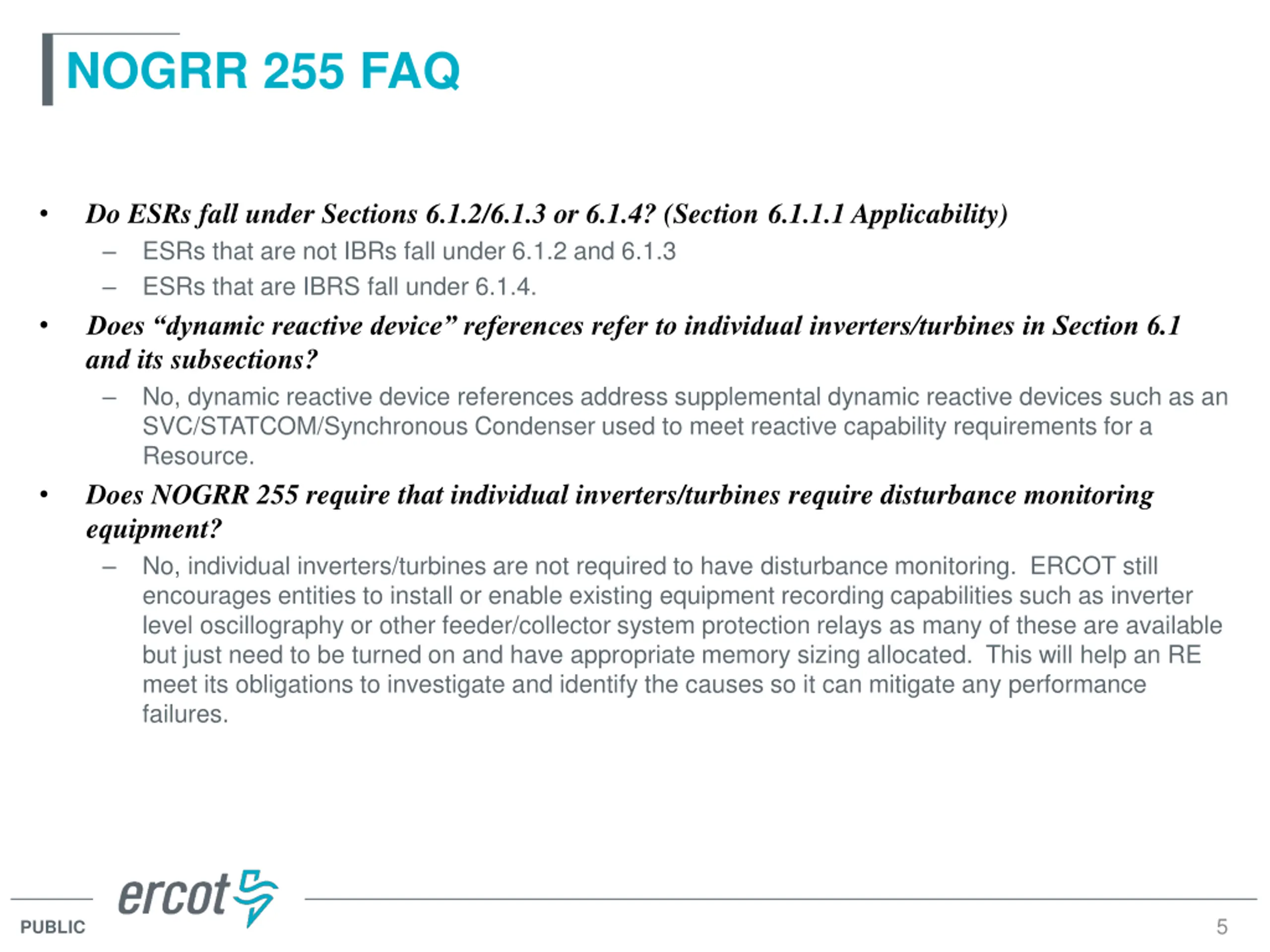 NOGRR 255 FAQ Do ESRs fall under Sections 6.1.2/6.1.3 or 6.1.4? (Section6.1.1.1 Applicability) ESRs that are not IBRs fall under 6.1.2 and 6.1.3 ESRs that are IBRS fall under 6.1.4. Does dynamic reactive device references refer to individual inverters/turbines in Section 6.1 and its subsections? No, dynamic reactive device references address supplemental dynamic reactive devices such as an SVC/STATCOM/Synchronous Condenser used to meet reactive capability requirements for a Resource. Does NOGRR 255 require that individual inverters/turbines require disturbance monitoring equipment? No, individual inverters/turbines are not required to have disturbance monitoring. ERCOT still encourages entities to install or enable existing equipment recording capabilities such as inverter level oscillography or other feeder/collector system protection relays as many of these are available but just need to be turned on and have appropriate memory sizing allocated. This will help an RE meet its obligations to investigate and identify the causes so it can mitigate any performance failures. 5 PUBLIC