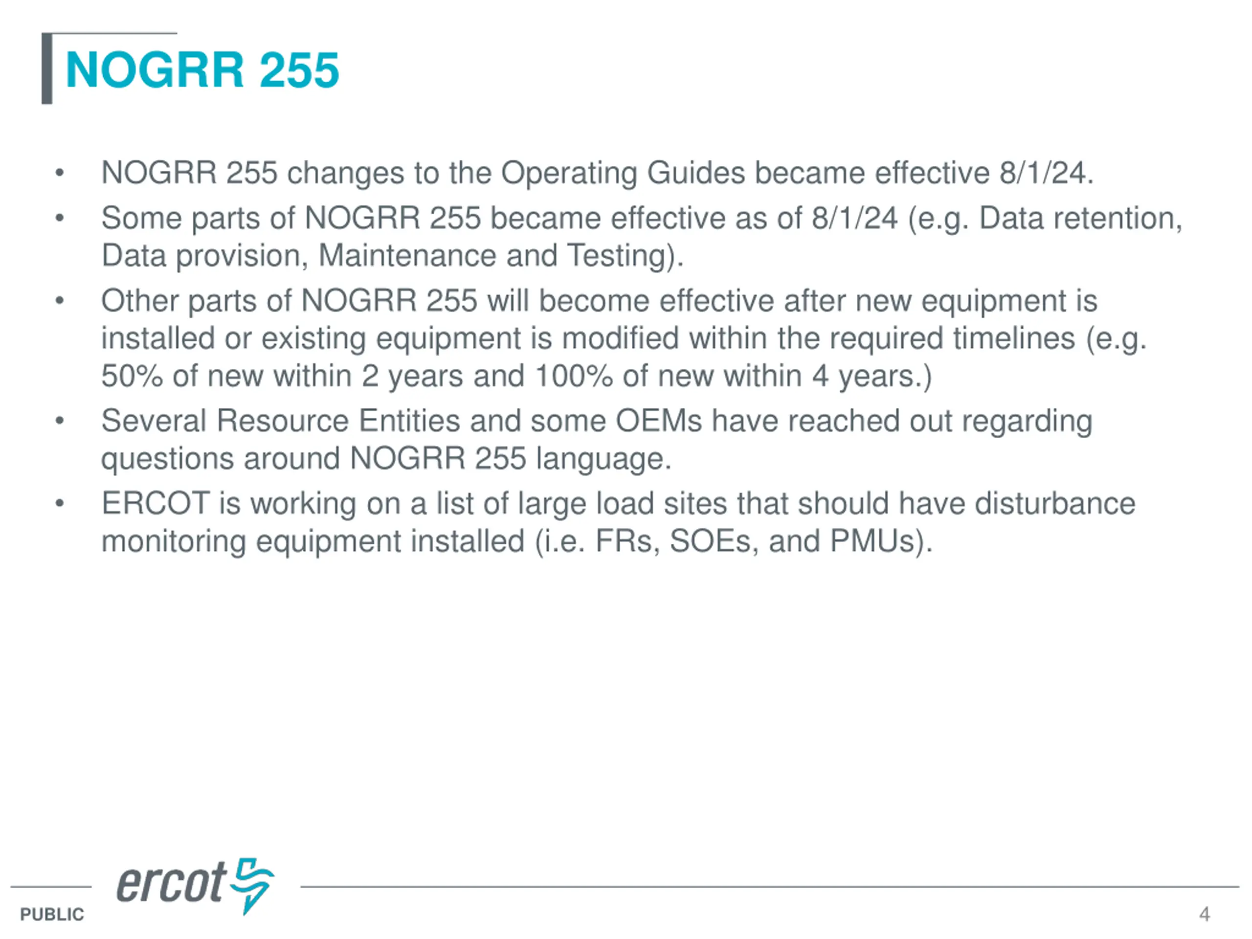 NOGRR 255 NOGRR 255 changes to the Operating Guides became effective 8/1/24. Some parts of NOGRR 255 became effective as of 8/1/24 (e.g. Data retention, Data provision, Maintenance and Testing). Other parts of NOGRR 255 will become effective after new equipment is installed or existing equipment is modified within the required timelines (e.g. 50% of new within 2 years and 100% of new within 4 years.) Several Resource Entities and some OEMs have reached out regarding questions around NOGRR 255 language. ERCOT is working on a list of large load sites that should have disturbance monitoring equipment installed (i.e. FRs, SOEs, and PMUs). 4 PUBLIC