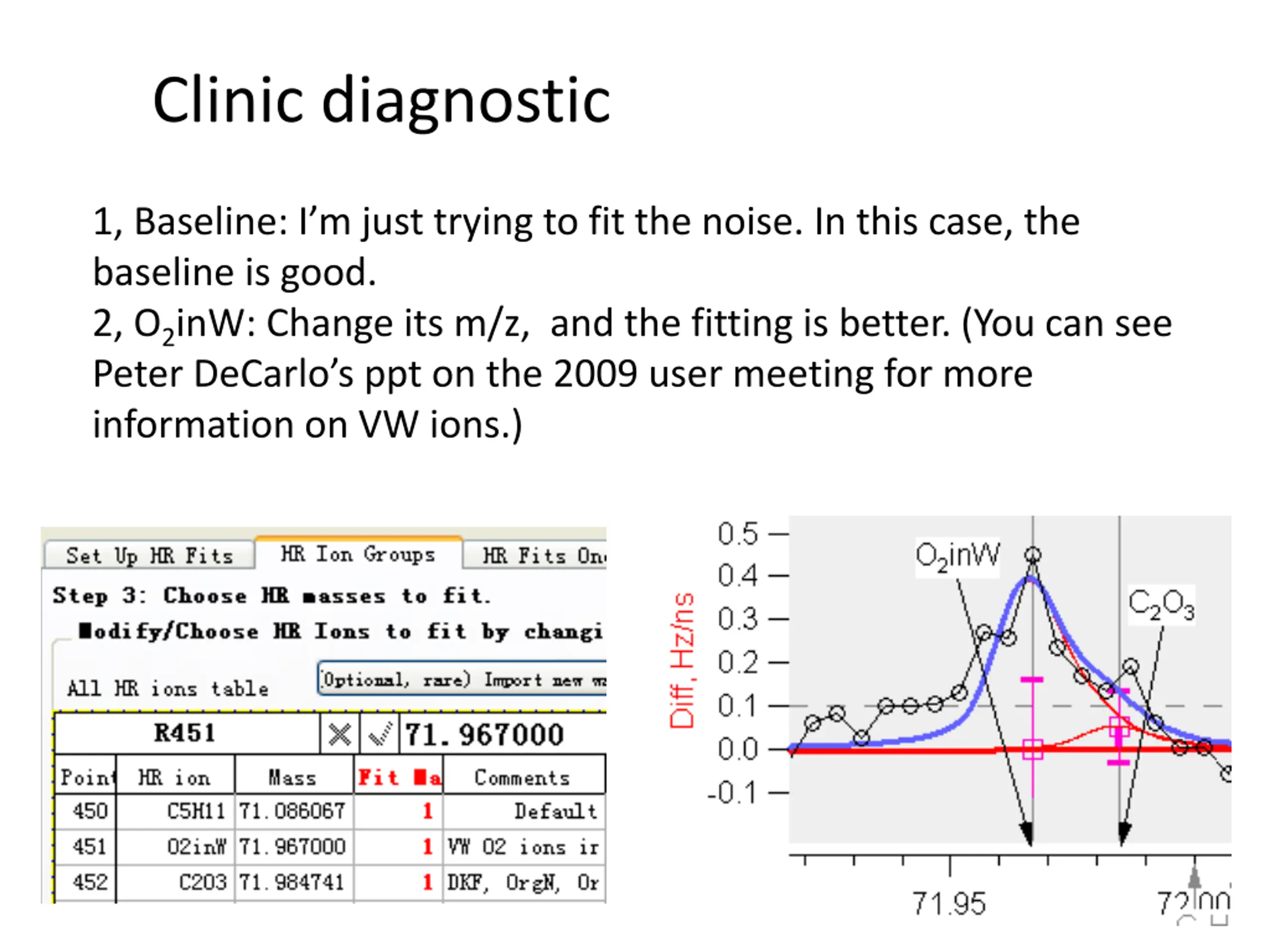 Clinic diagnostic 1, Baseline: I m just trying to fit the noise. In this case, the baseline is good. 2, O2inW: Change its m/z, and the fitting is better. (You can see Peter DeCarlo s ppt on the 2009 user meeting for more information on VW ions.)