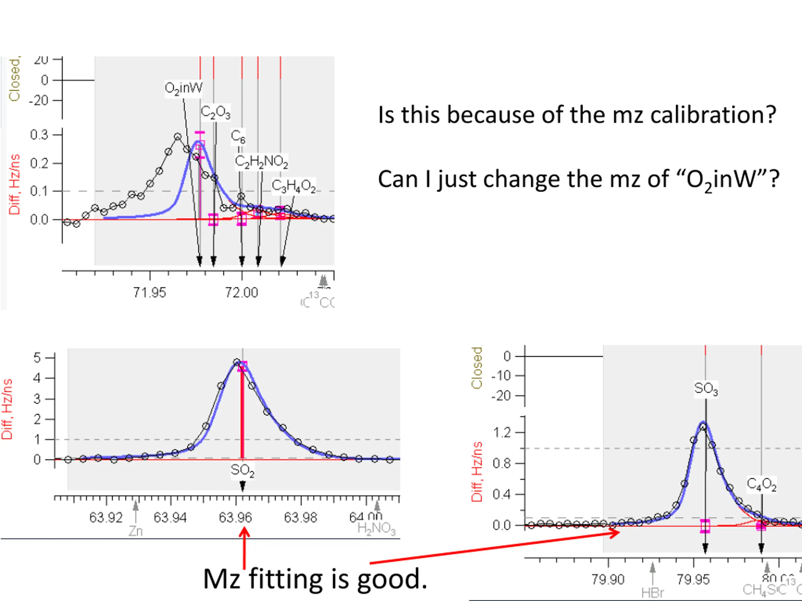 Is this because of the mz calibration? Can I just change the mz of O2inW ? Mz fitting is good.
