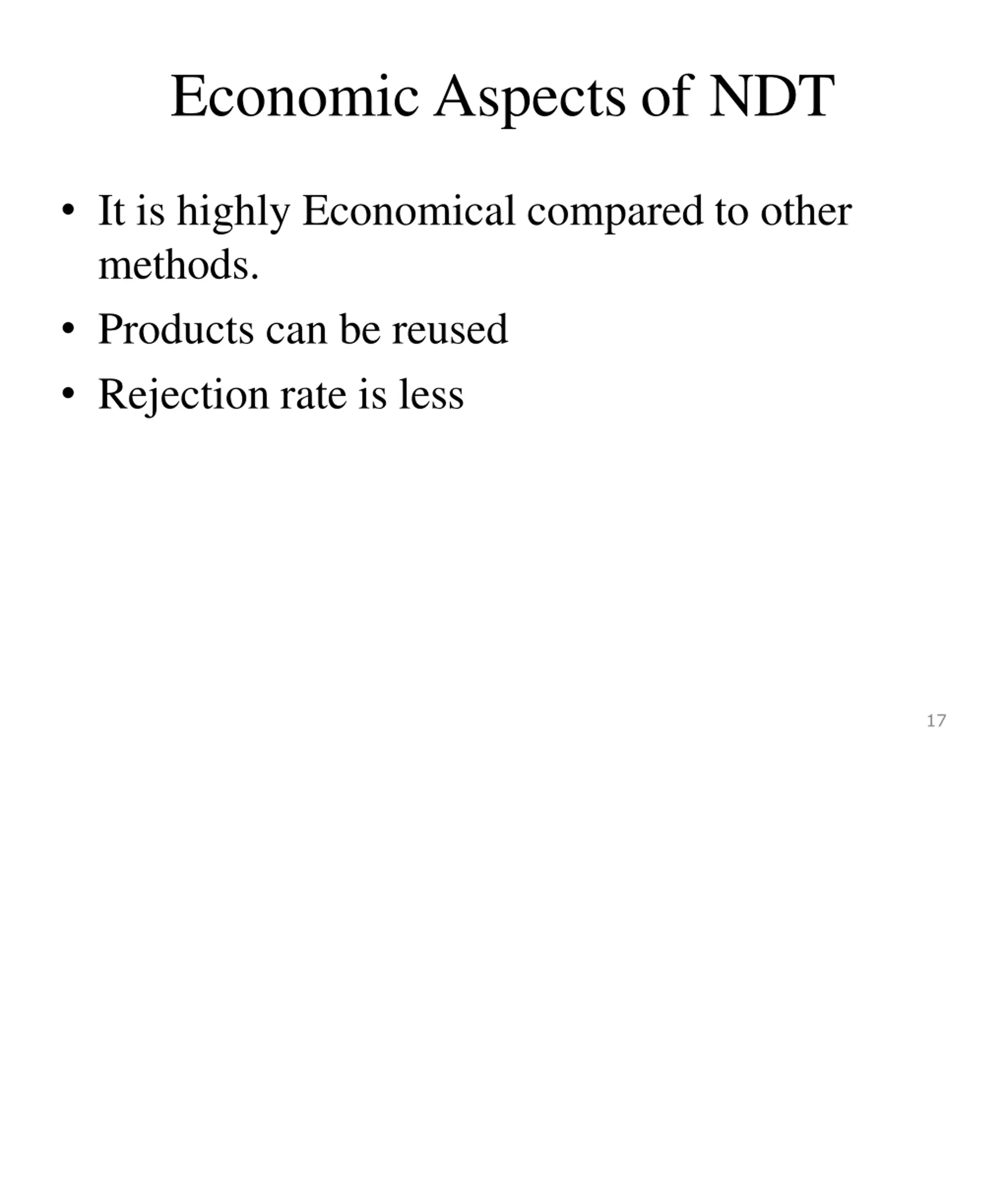 Economic Aspects of NDT It is highly Economical compared to other methods. Products can be reused Rejection rate is less 17