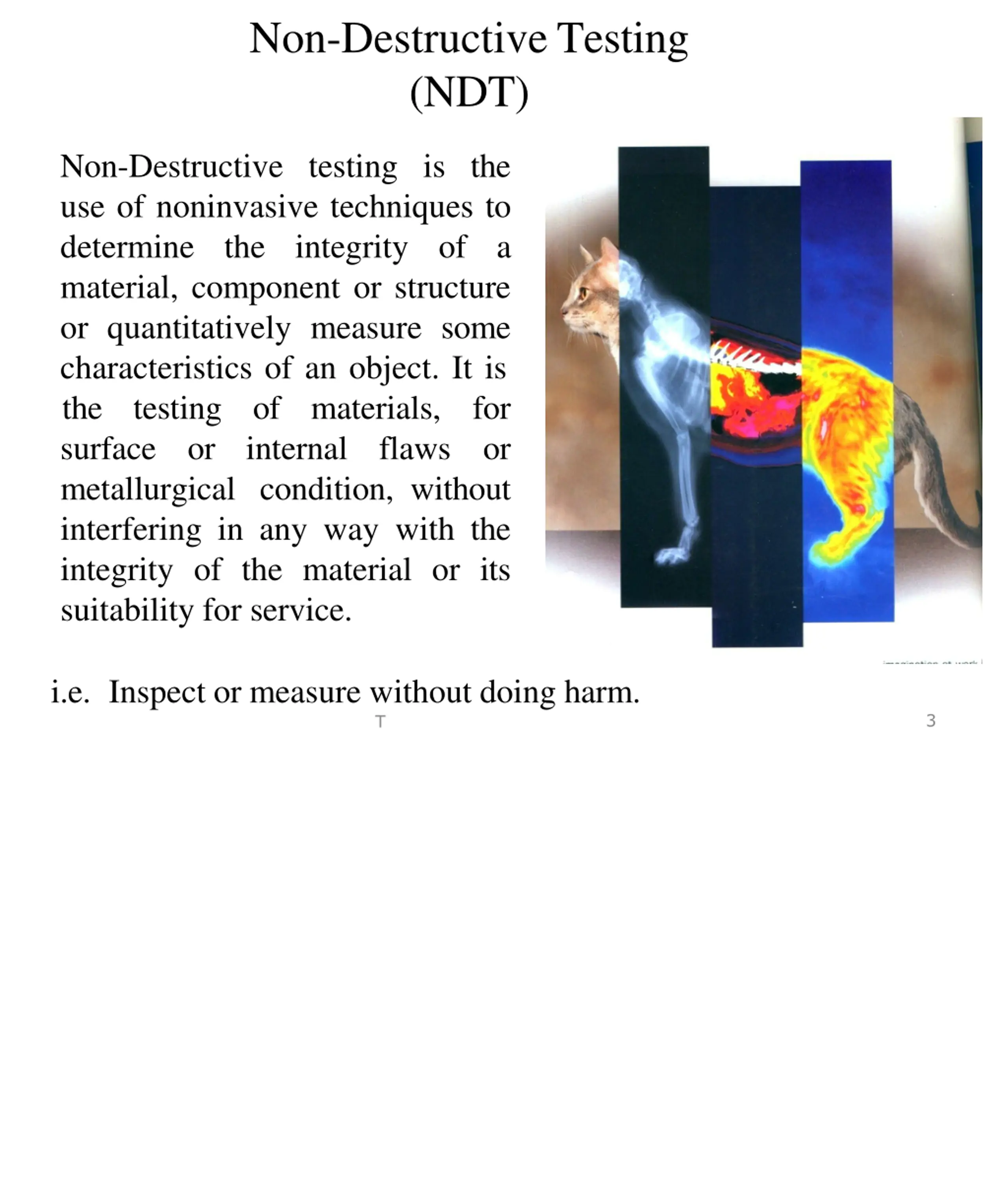 Non-Destructive Testing (NDT) Non-Destructive testing is the use of noninvasive techniques to determine the integrity of a material, component or structure or quantitatively measure some characteristics of an object. It is the testing of materials, for surface or internal flaws metallurgical condition, without interfering in any way with the integrity of the material or its suitability for service. or i.e. Inspect or measure without doing harm. 3 T