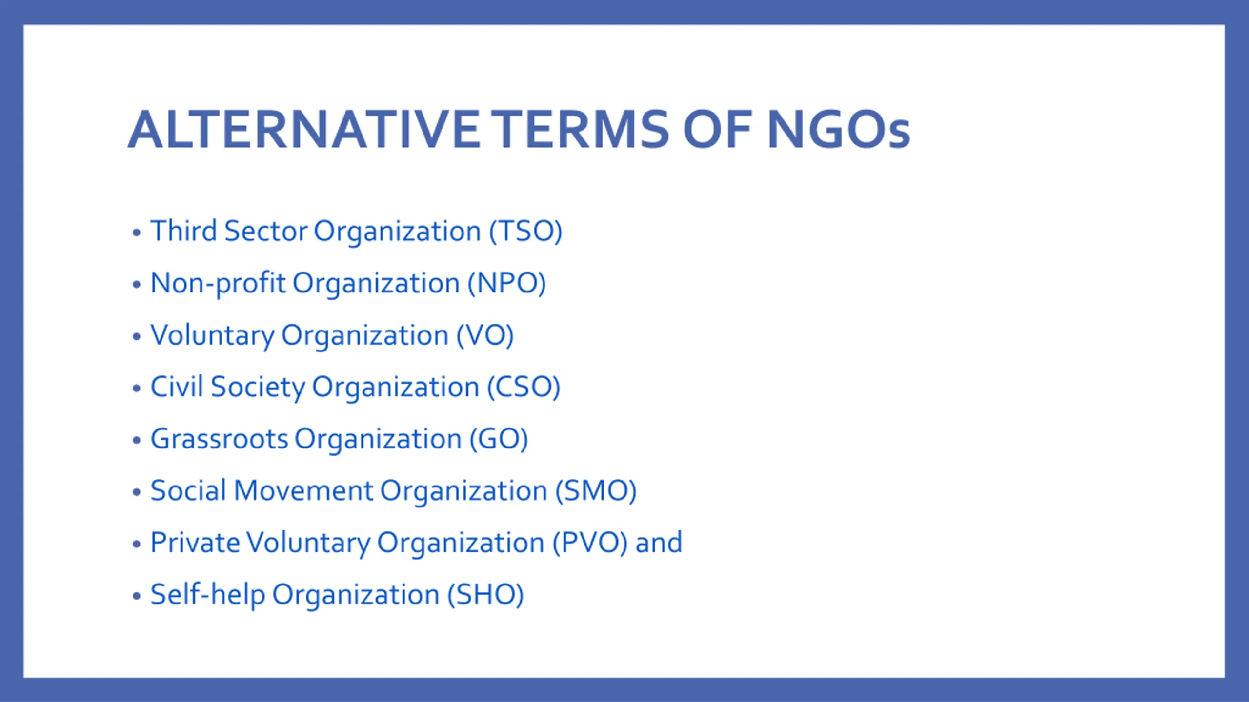 ALTERNATIVE TERMS OF NGOs Third Sector Organization (TSO) Non-profit Organization (NPO) Voluntary Organization (VO) Civil Society Organization (CSO) Grassroots Organization (GO) Social Movement Organization (SMO) Private Voluntary Organization (PVO) and Self-help Organization (SHO)
