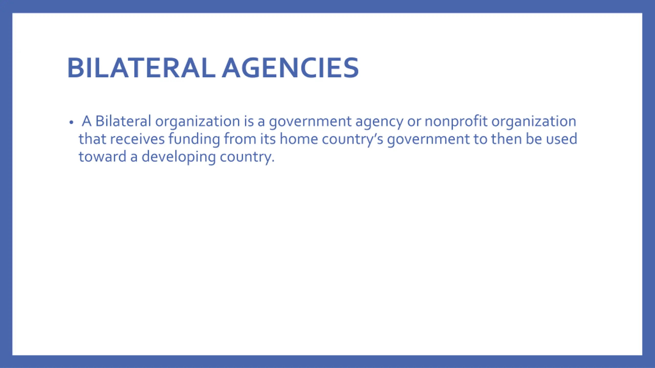 BILATERAL AGENCIES A Bilateral organization is a government agency or nonprofit organization that receives funding from its home country s government to then be used toward a developing country.