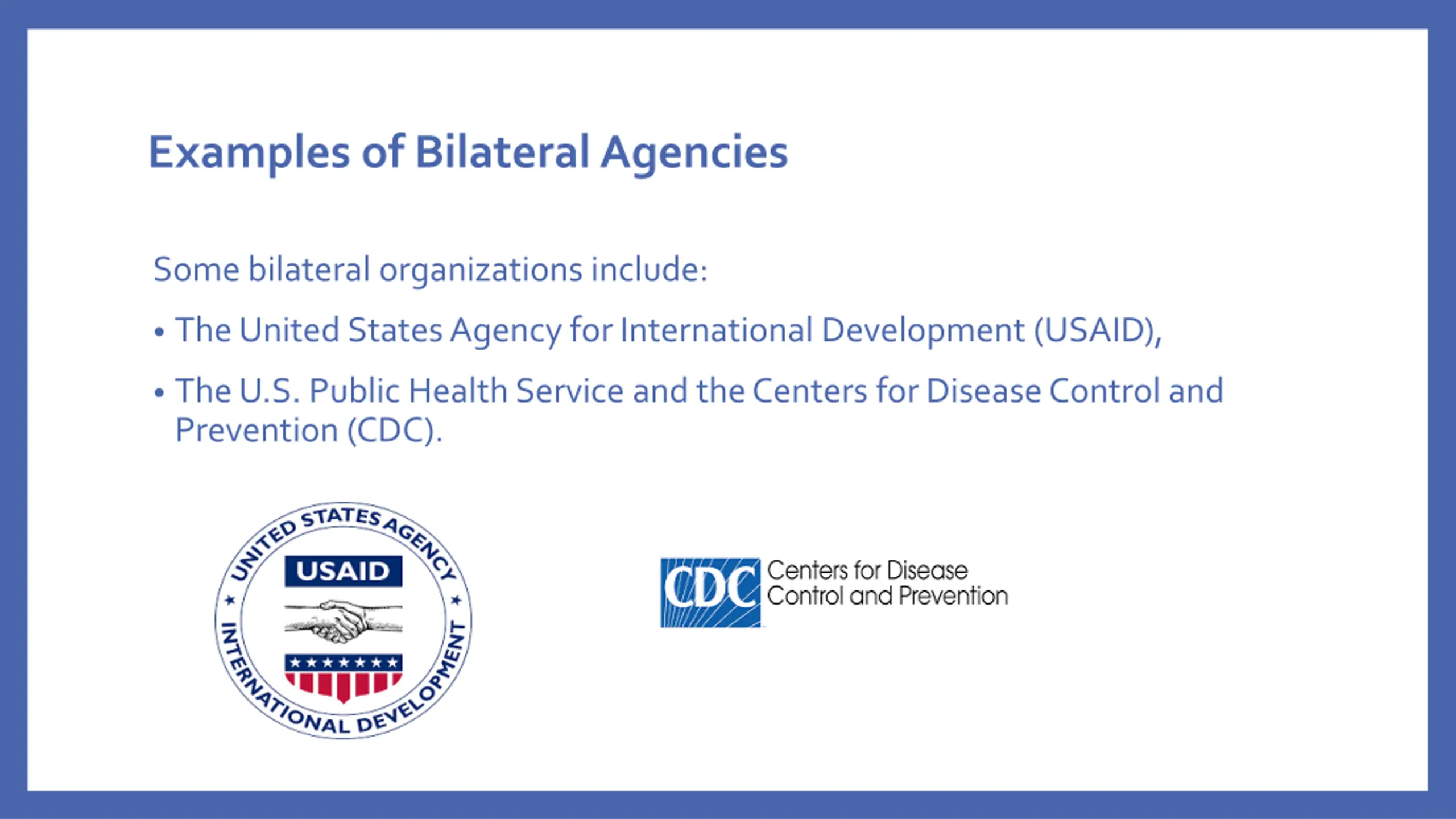 Examples of Bilateral Agencies Some bilateral organizations include: The United States Agency for International Development (USAID), The U.S. Public Health Service and the Centers for Disease Control and Prevention (CDC).