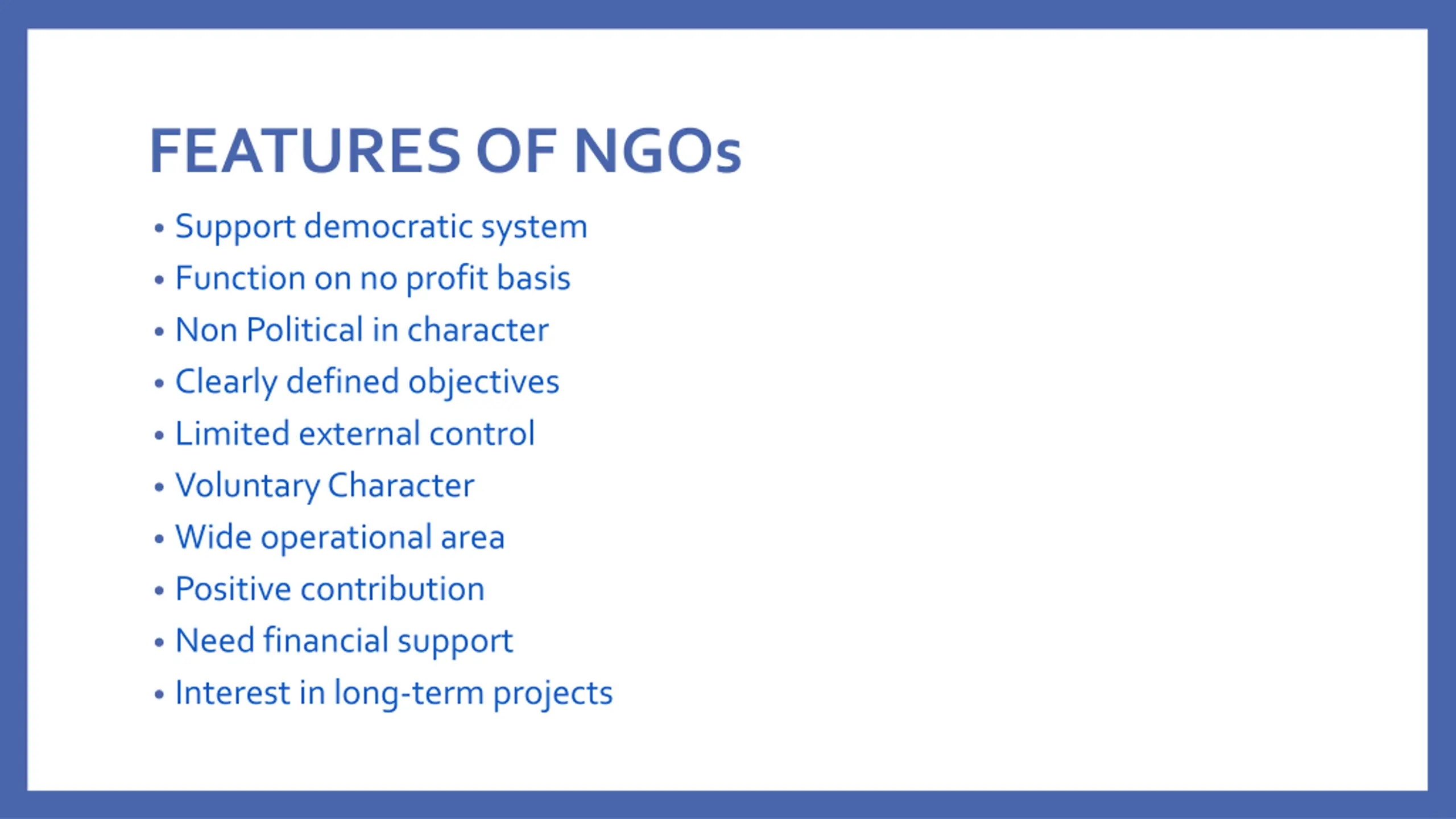 FEATURES OF NGOs Support democratic system Function on no profit basis Non Political in character Clearly defined objectives Limited external control Voluntary Character Wide operational area Positive contribution Need financial support Interest in long-term projects