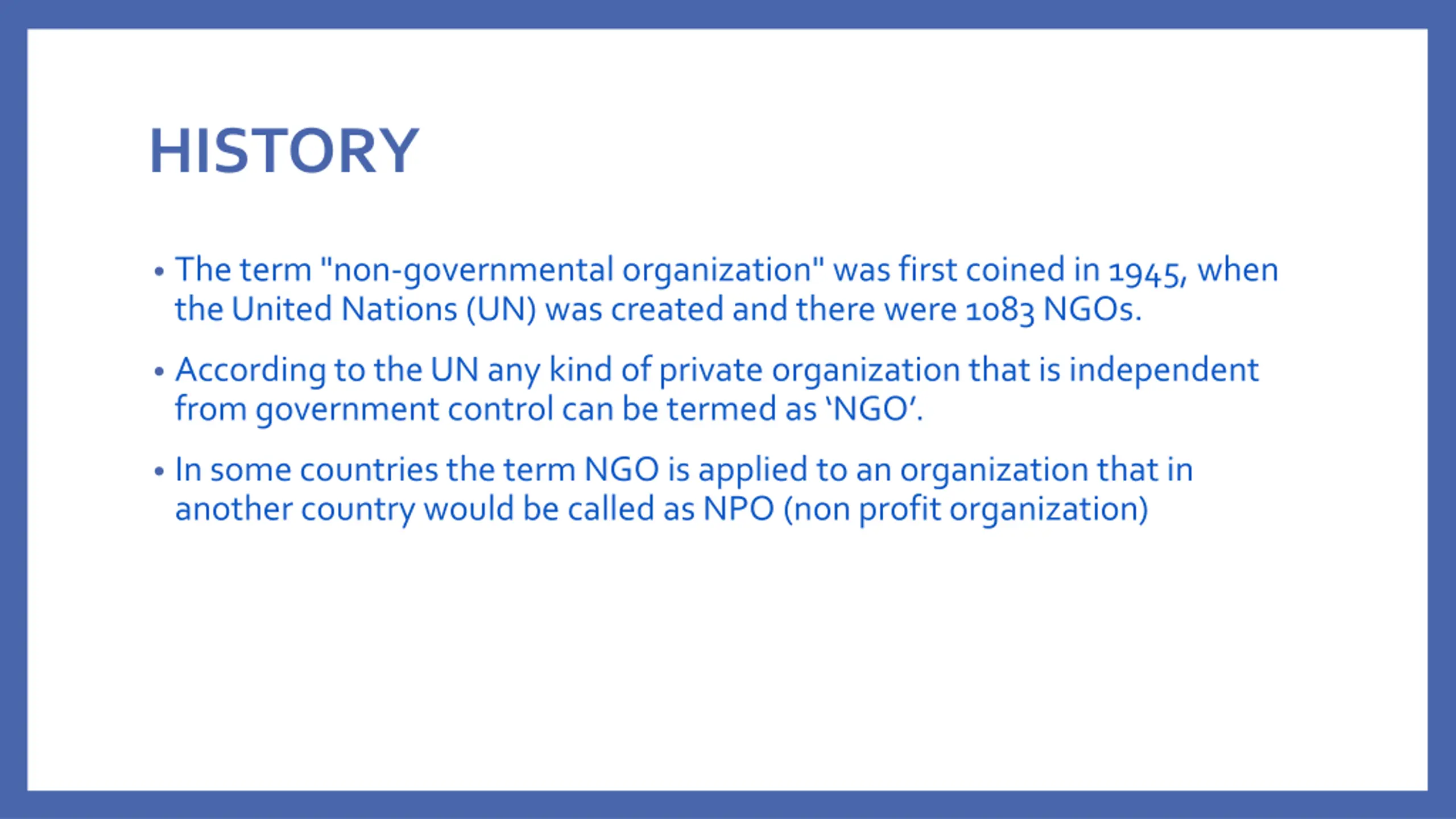 HISTORY The term "non-governmental organization" was first coined in 1945, when the United Nations (UN) was created and there were 1083 NGOs. According to the UN any kind of private organization that is independent from government control can be termed as NGO . In some countries the term NGO is applied to an organization that in another country would be called as NPO (non profit organization)