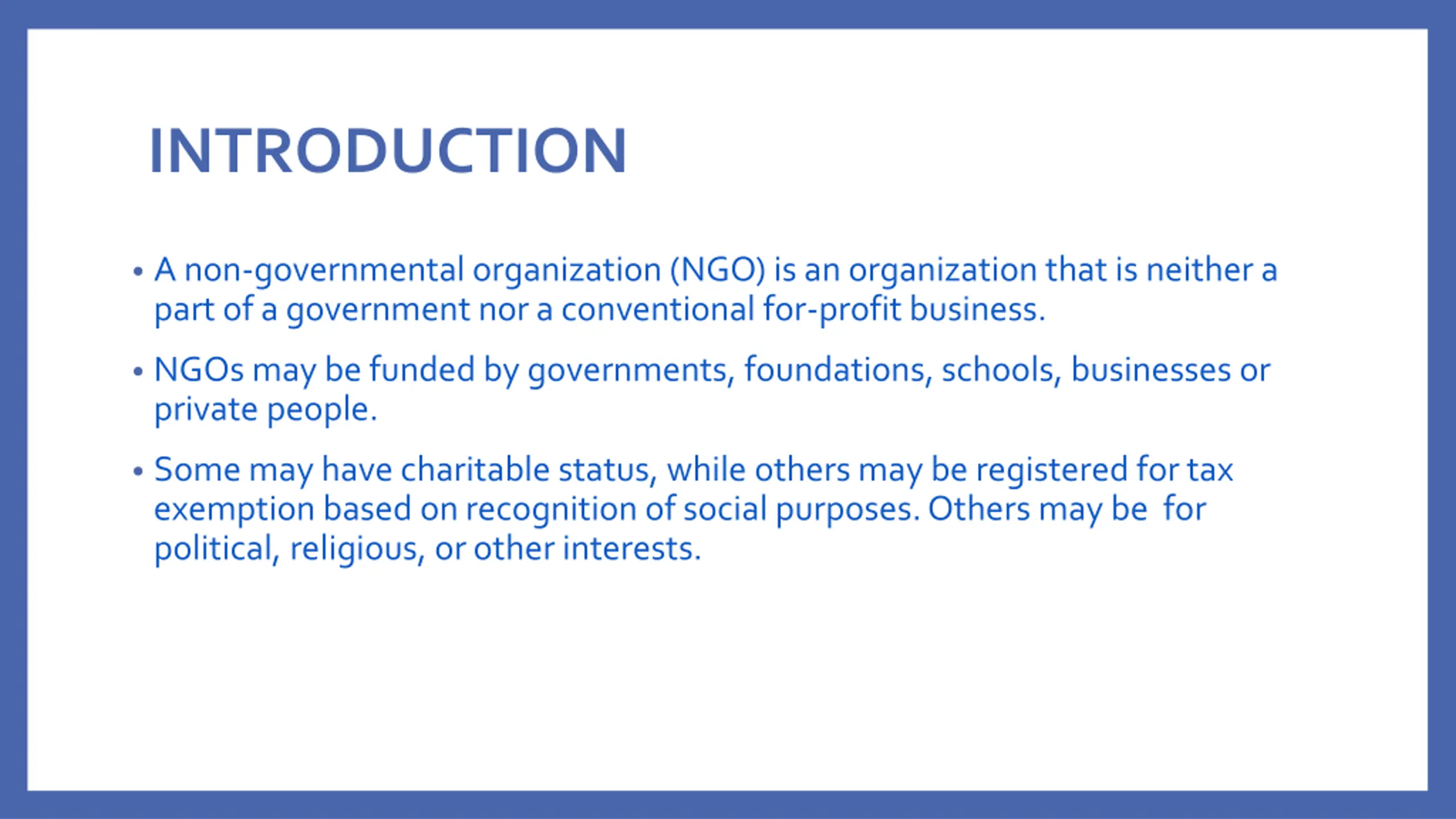INTRODUCTION A non-governmental organization (NGO) is an organization that is neither a part of a government nor a conventional for-profit business. NGOs may be funded by governments, foundations, schools, businesses or private people. Some may have charitable status, while others may be registered for tax exemption based on recognition of social purposes. Others may be for political, religious, or other interests.