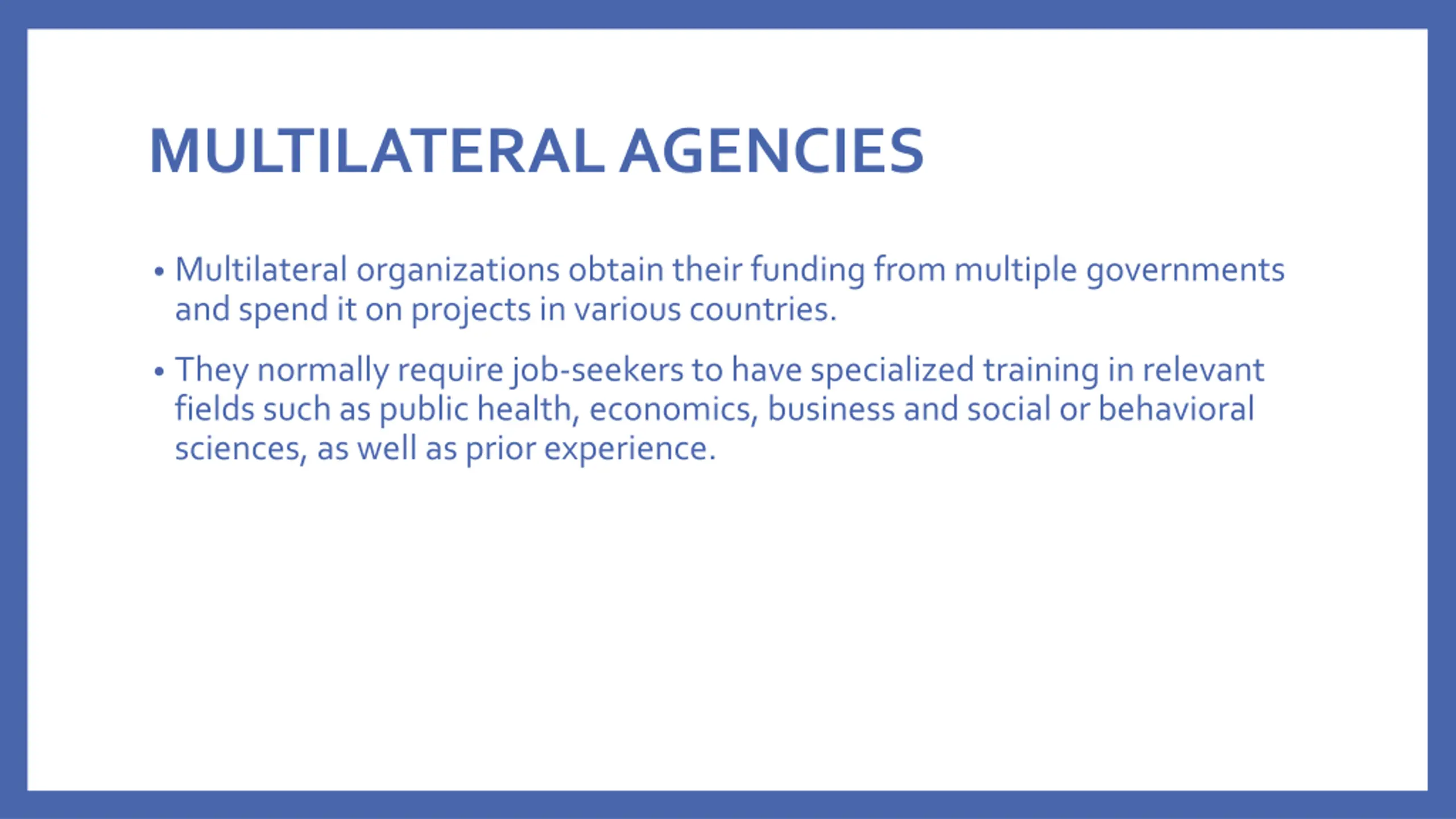 MULTILATERAL AGENCIES Multilateral organizations obtain their funding from multiple governments and spend it on projects in various countries. They normally require job-seekers to have specialized training in relevant fields such as public health, economics, business and social or behavioral sciences, as well as prior experience.