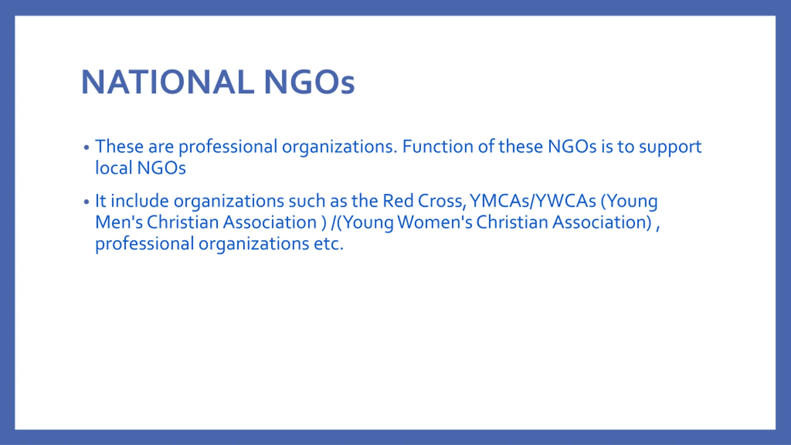 NATIONAL NGOs These are professional organizations. Function of these NGOs is to support local NGOs It include organizations such as the Red Cross, YMCAs/YWCAs (Young Men's Christian Association ) /(Young Women's Christian Association) , professional organizations etc.