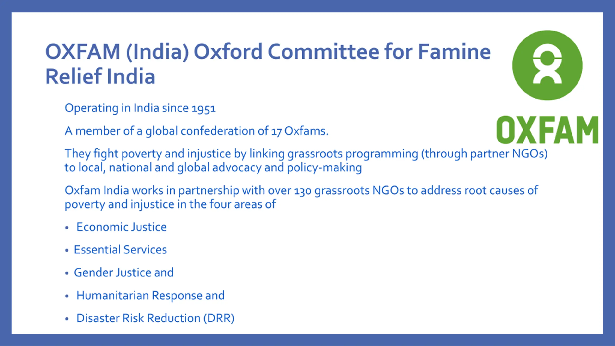 OXFAM (India) Oxford Committee for Famine Relief India Operating in India since 1951 A member of a global confederation of 17 Oxfams. They fight poverty and injustice by linking grassroots programming (through partner NGOs) to local, national and global advocacy and policy-making Oxfam India works in partnership with over 130 grassroots NGOs to address root causes of poverty and injustice in the four areas of Economic Justice Essential Services Gender Justice and Humanitarian Response and Disaster Risk Reduction (DRR)