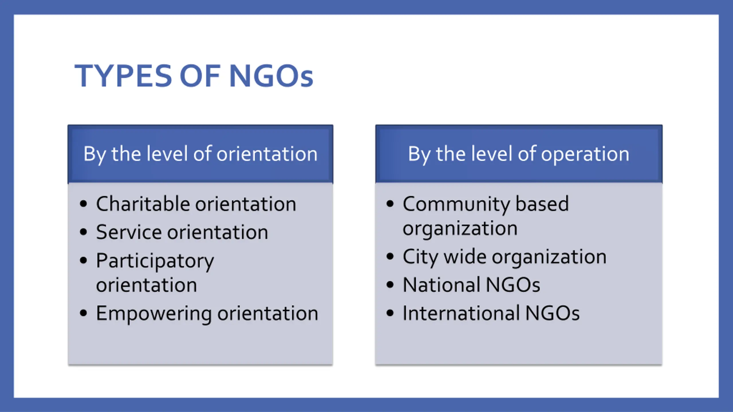 TYPES OF NGOs By the level of orientation By the level of operation Charitable orientation Service orientation Participatory orientation Empowering orientation Community based organization City wide organization National NGOs International NGOs