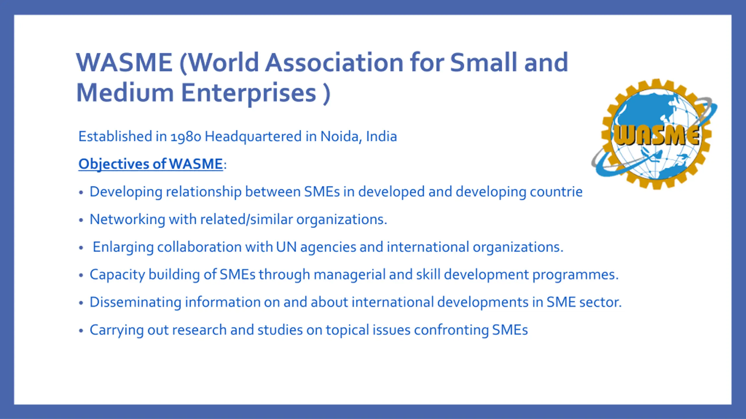 WASME (World Association for Small and Medium Enterprises ) Established in 1980 Headquartered in Noida, India Objectives of WASME: Developing relationship between SMEs in developed and developing countries. Networking with related/similar organizations. Enlarging collaboration with UN agencies and international organizations. Capacity building of SMEs through managerial and skill development programmes. Disseminating information on and about international developments in SME sector. Carrying out research and studies on topical issues confronting SMEs
