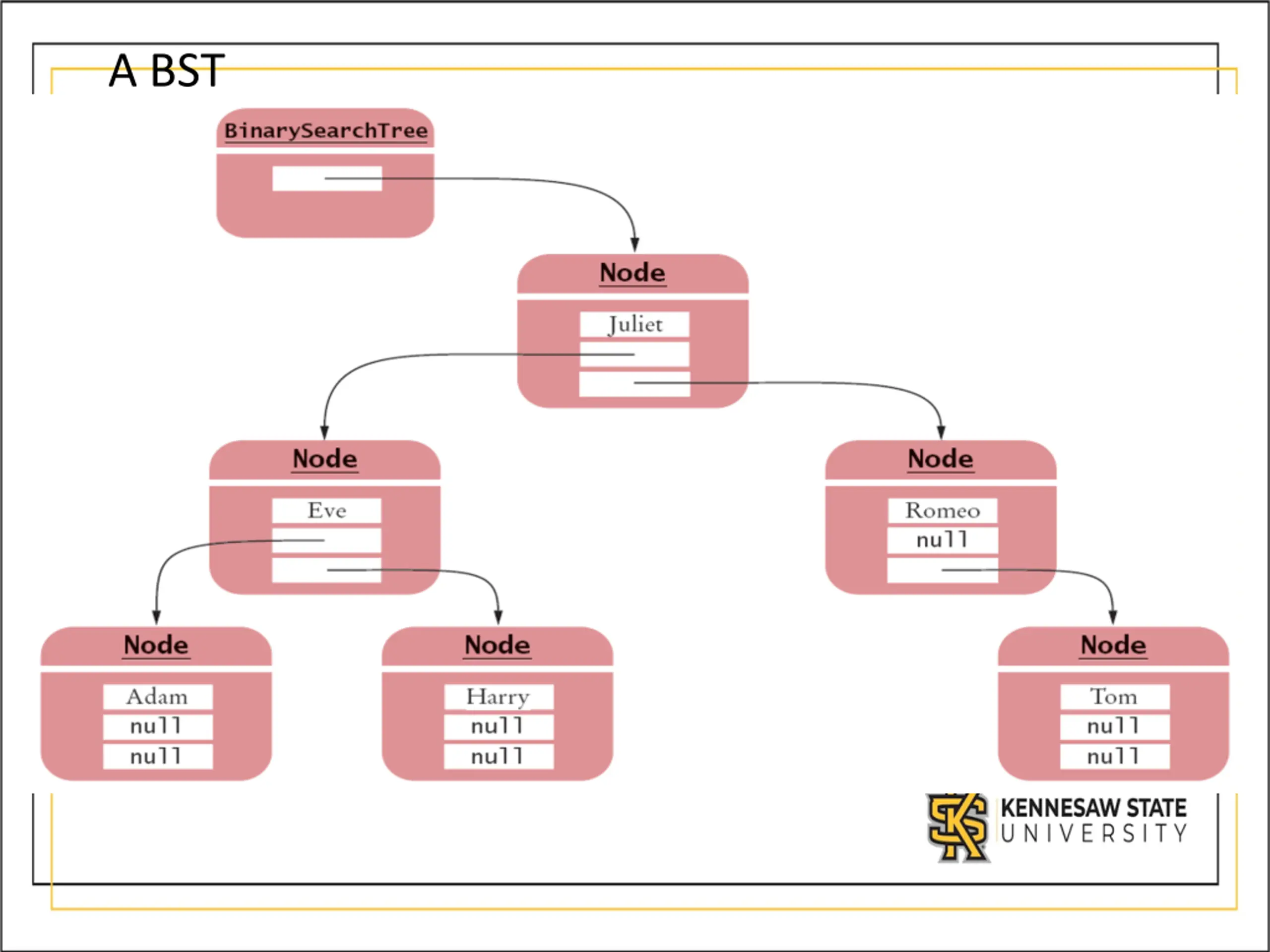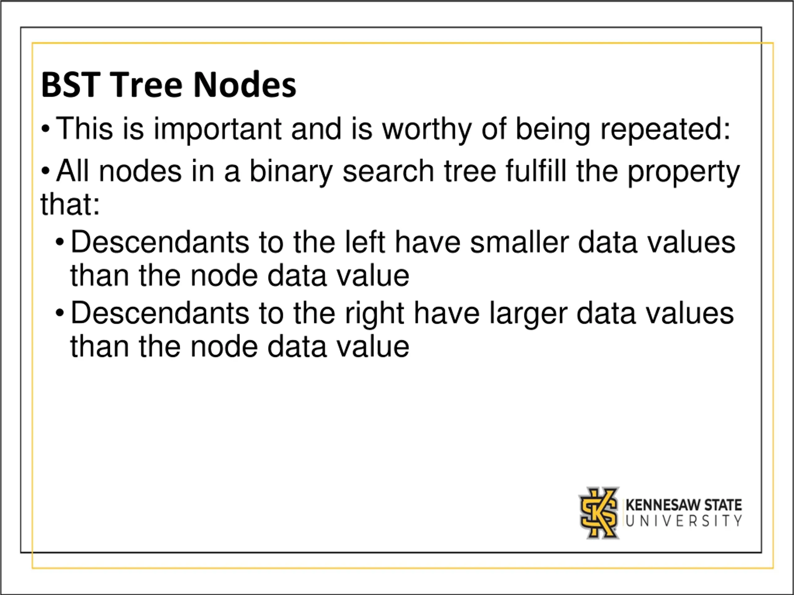 BST Tree Nodes This is important and is worthy of being repeated: All nodes in a binary search tree fulfill the property that: Descendants to the left have smaller data values than the node data value Descendants to the right have larger data values than the node data value