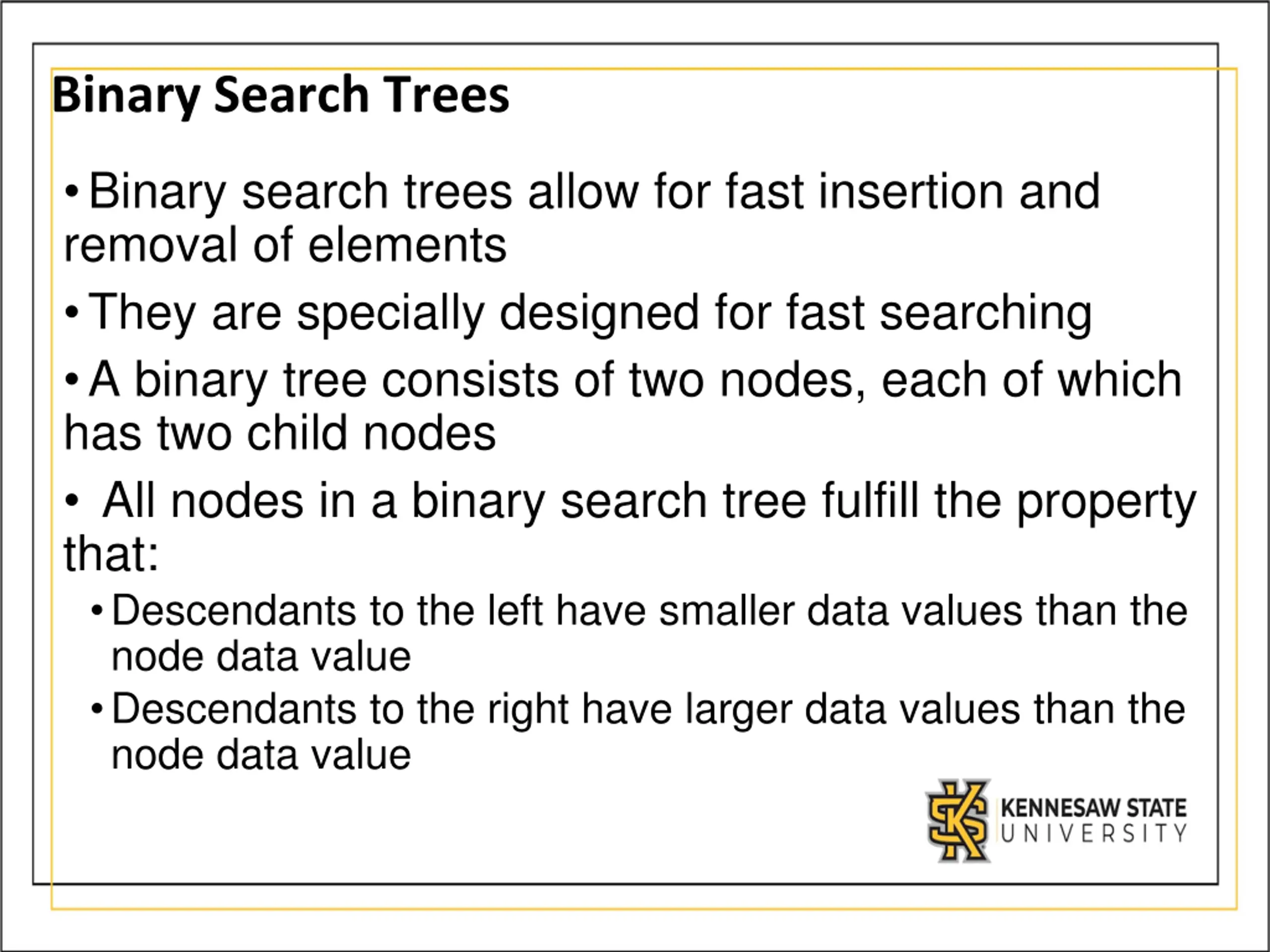 Binary Search Trees Binary search trees allow for fast insertion and removal of elements They are specially designed for fast searching A binary tree consists of two nodes, each of which has two child nodes All nodes in a binary search tree fulfill the property that: Descendants to the left have smaller data values than the node data value Descendants to the right have larger data values than the node data value