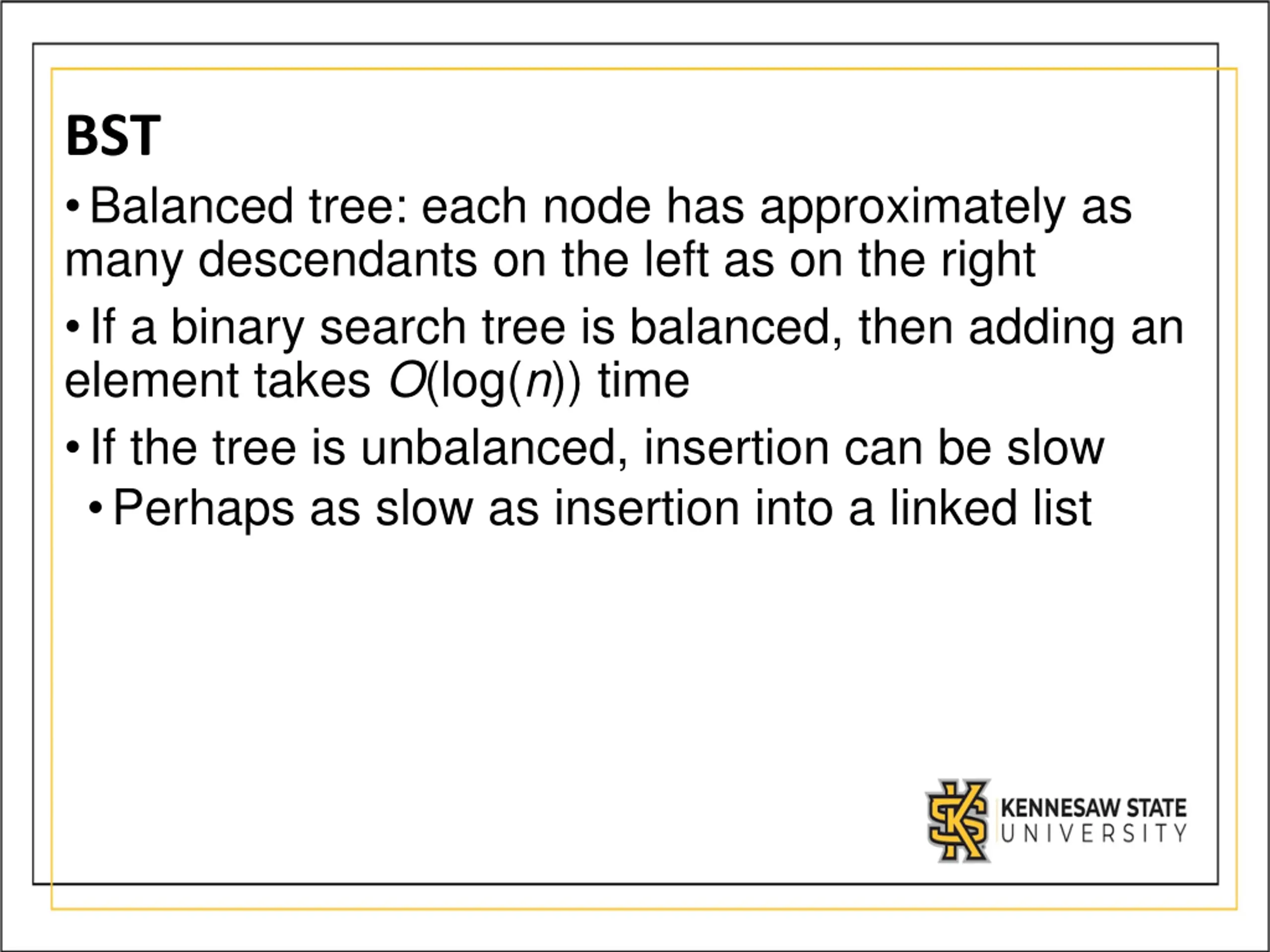 BST Balanced tree: each node has approximately as many descendants on the left as on the right If a binary search tree is balanced, then adding an element takes O(log(n)) time If the tree is unbalanced, insertion can be slow Perhaps as slow as insertion into a linked list