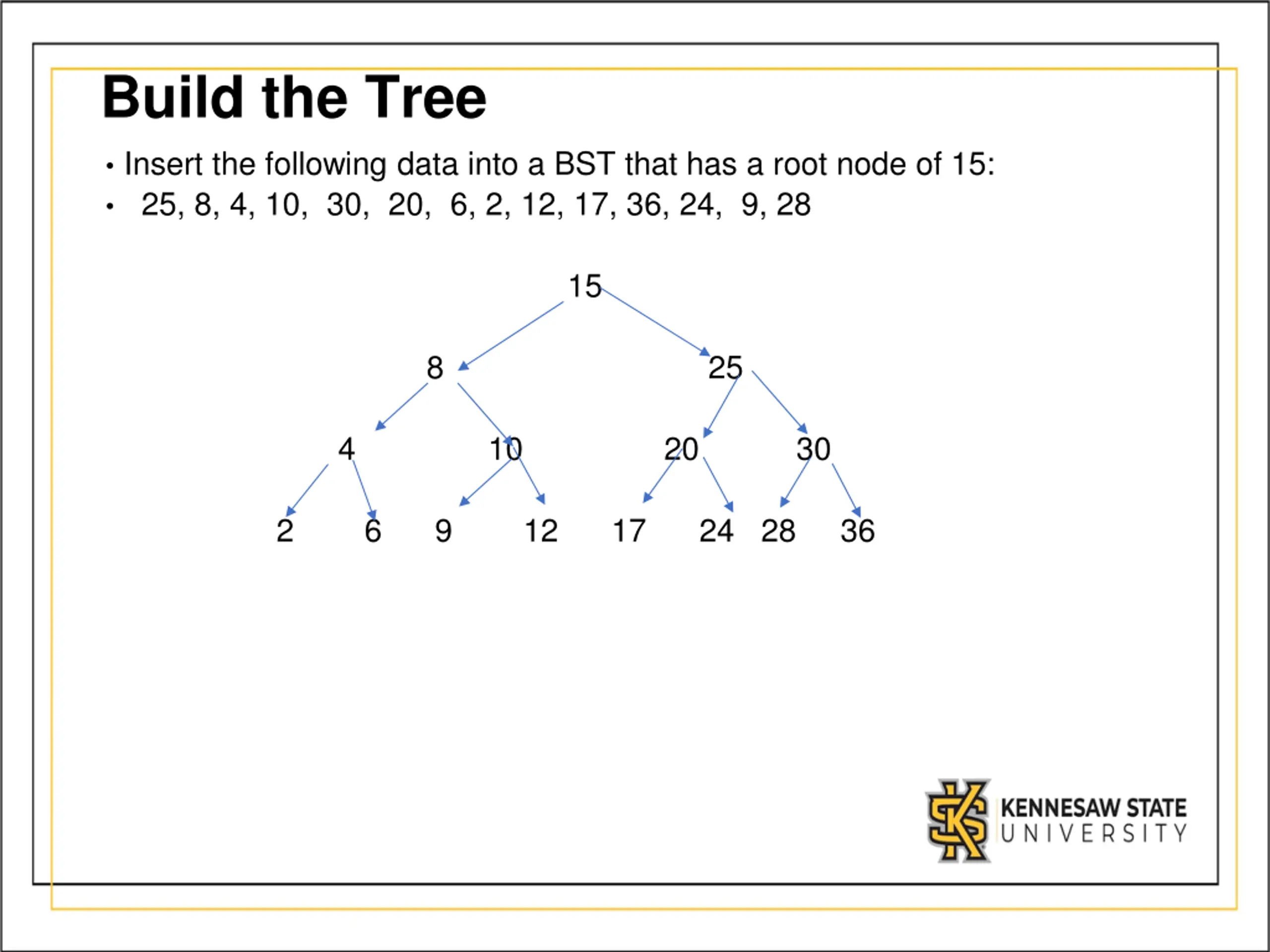 Build the Tree Insert the following data into a BST that has a root node of 15: 25, 8, 4, 10, 30, 20, 6, 2, 12, 17, 36, 24, 9, 28 15 8 25 4 10 20 30 2 6 9 12 17 24 28 36