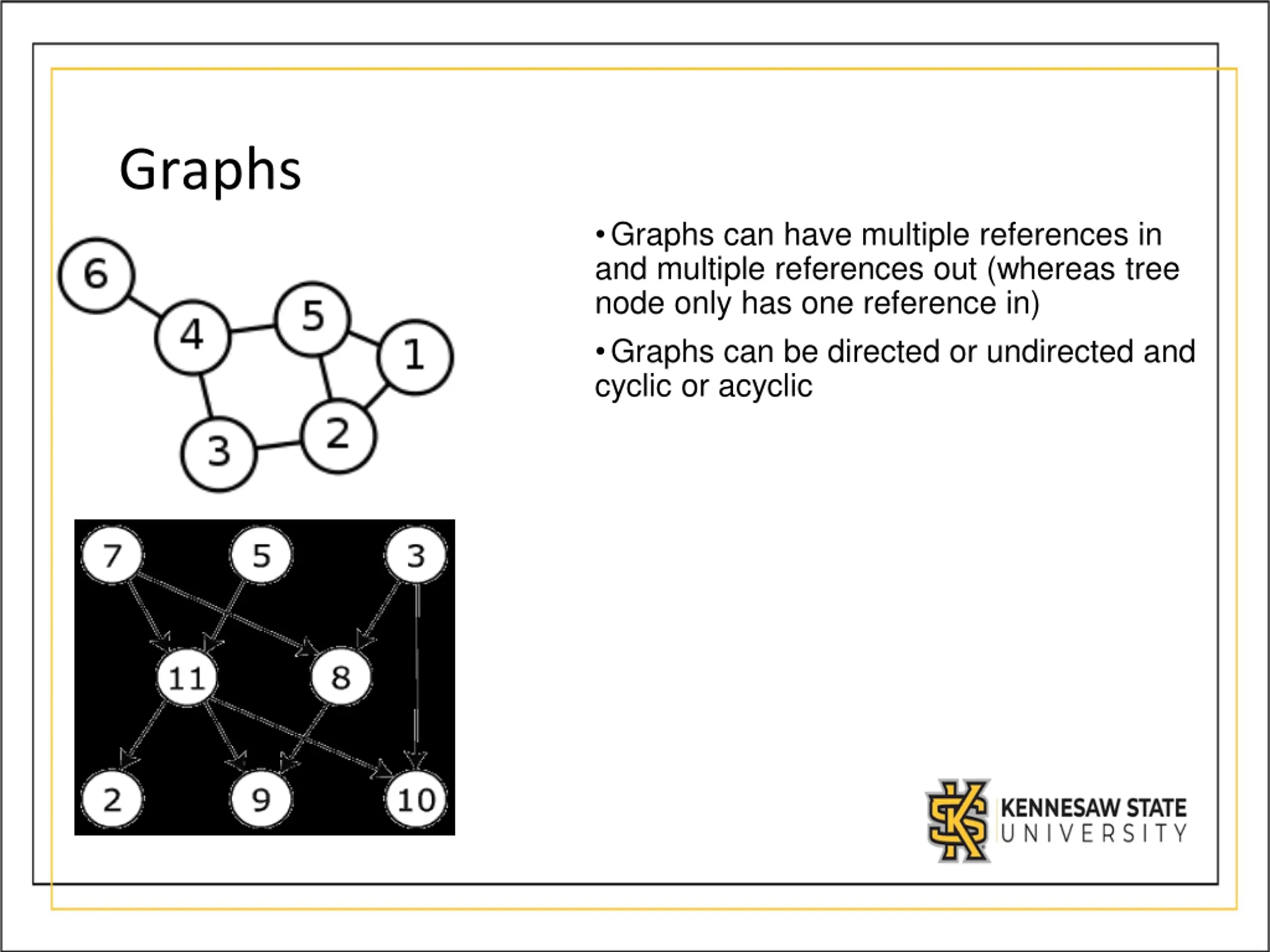 Graphs Graphs can have multiple references in and multiple references out (whereas tree node only has one reference in) Graphs can be directed or undirected and cyclic or acyclic