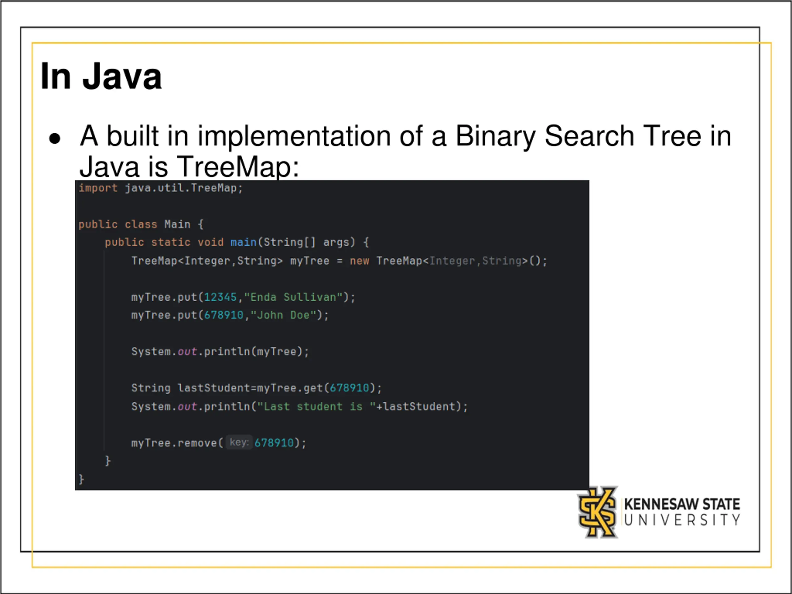 In Java A built in implementation of a Binary Search Tree in Java is TreeMap: