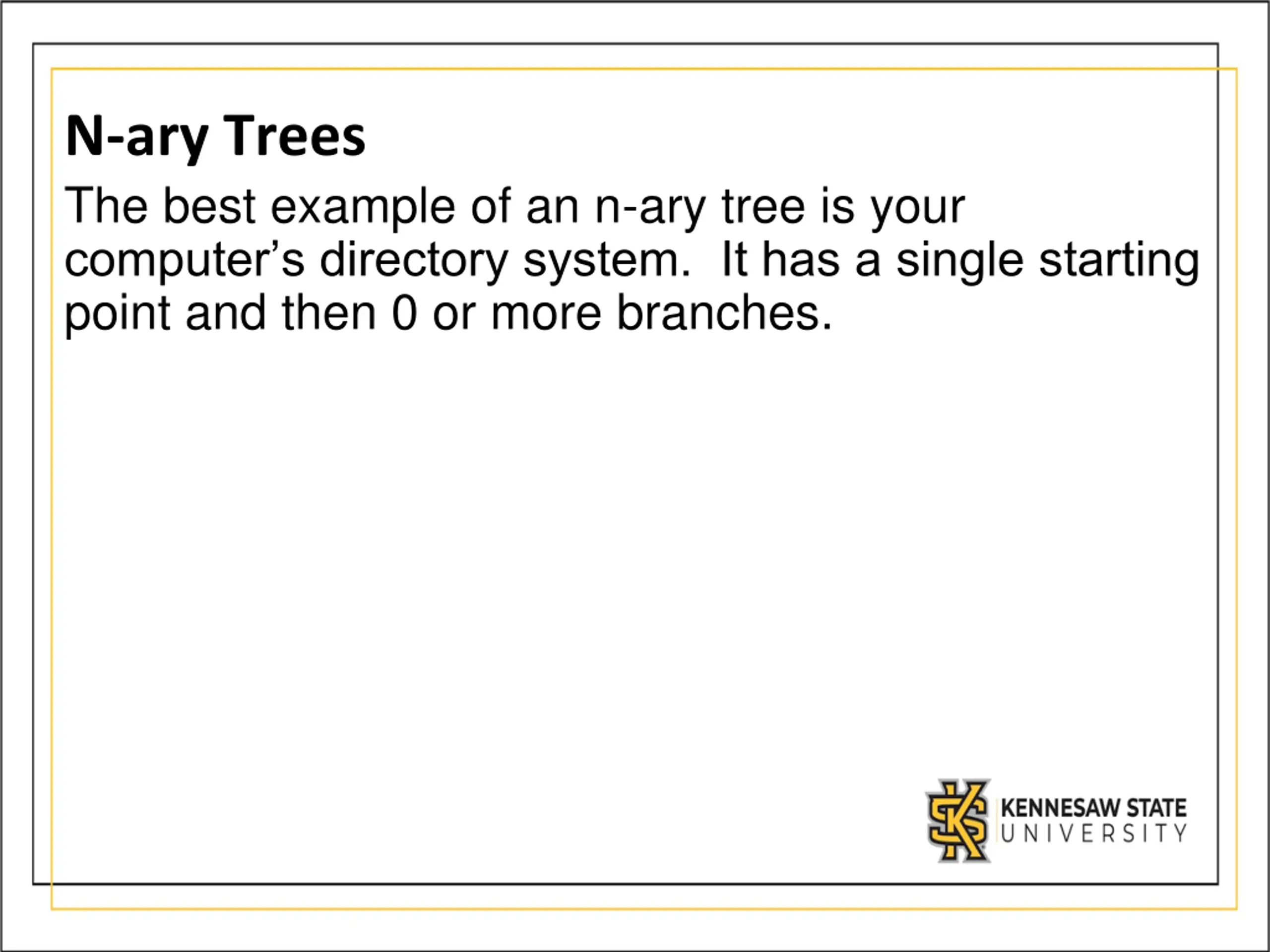 N-ary Trees The best example of an n-ary tree is your computer s directory system. It has a single starting point and then 0 or more branches.