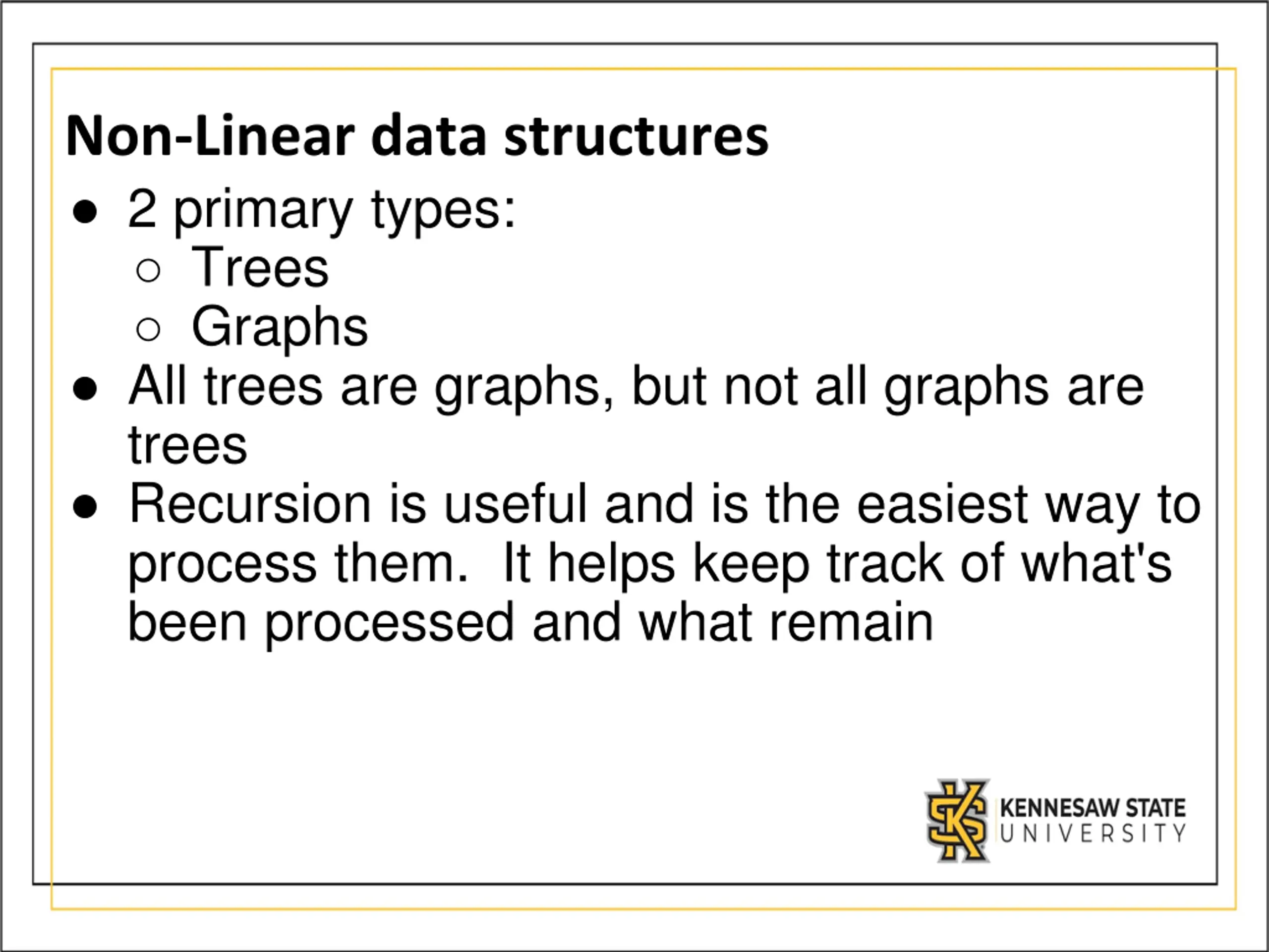 Non-Linear data structures 2 primary types: Trees Graphs All trees are graphs, but not all graphs are trees Recursion is useful and is the easiest way to process them. It helps keep track of what's been processed and what remain