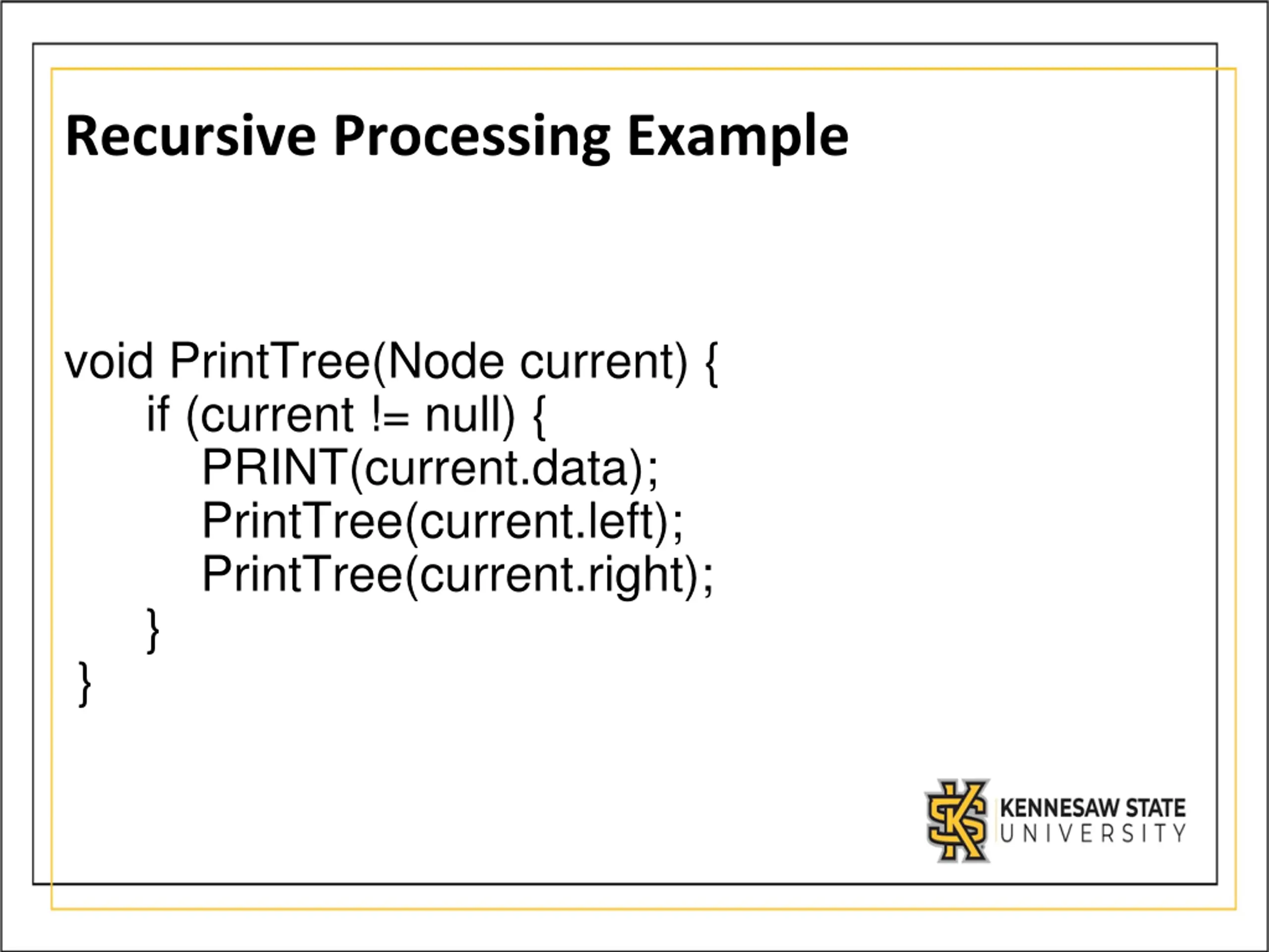 Recursive Processing Example void PrintTree(Node current) { if (current != null) { PRINT(current.data); PrintTree(current.left); PrintTree(current.right); } }