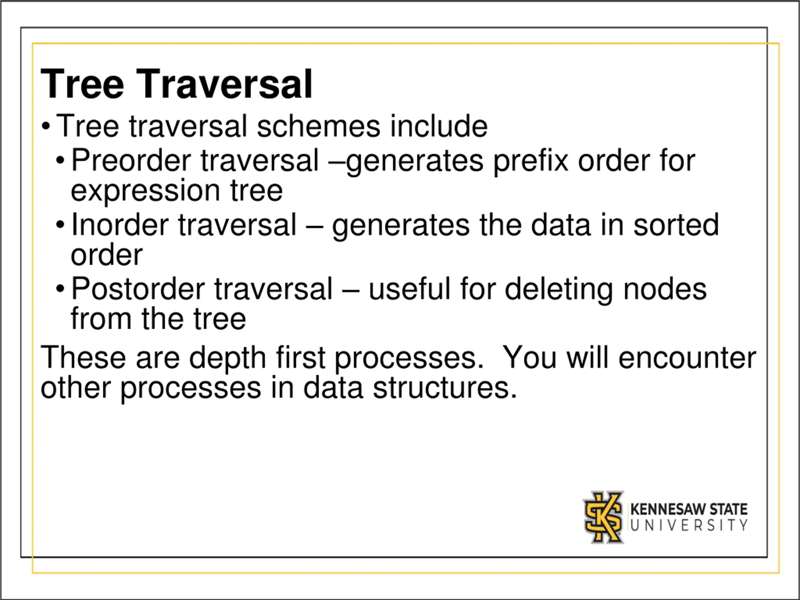 Tree Traversal Tree traversal schemes include Preorder traversal generates prefix order for expression tree Inorder traversal generates the data in sorted order Postorder traversal useful for deleting nodes from the tree These are depth first processes. You will encounter other processes in data structures.