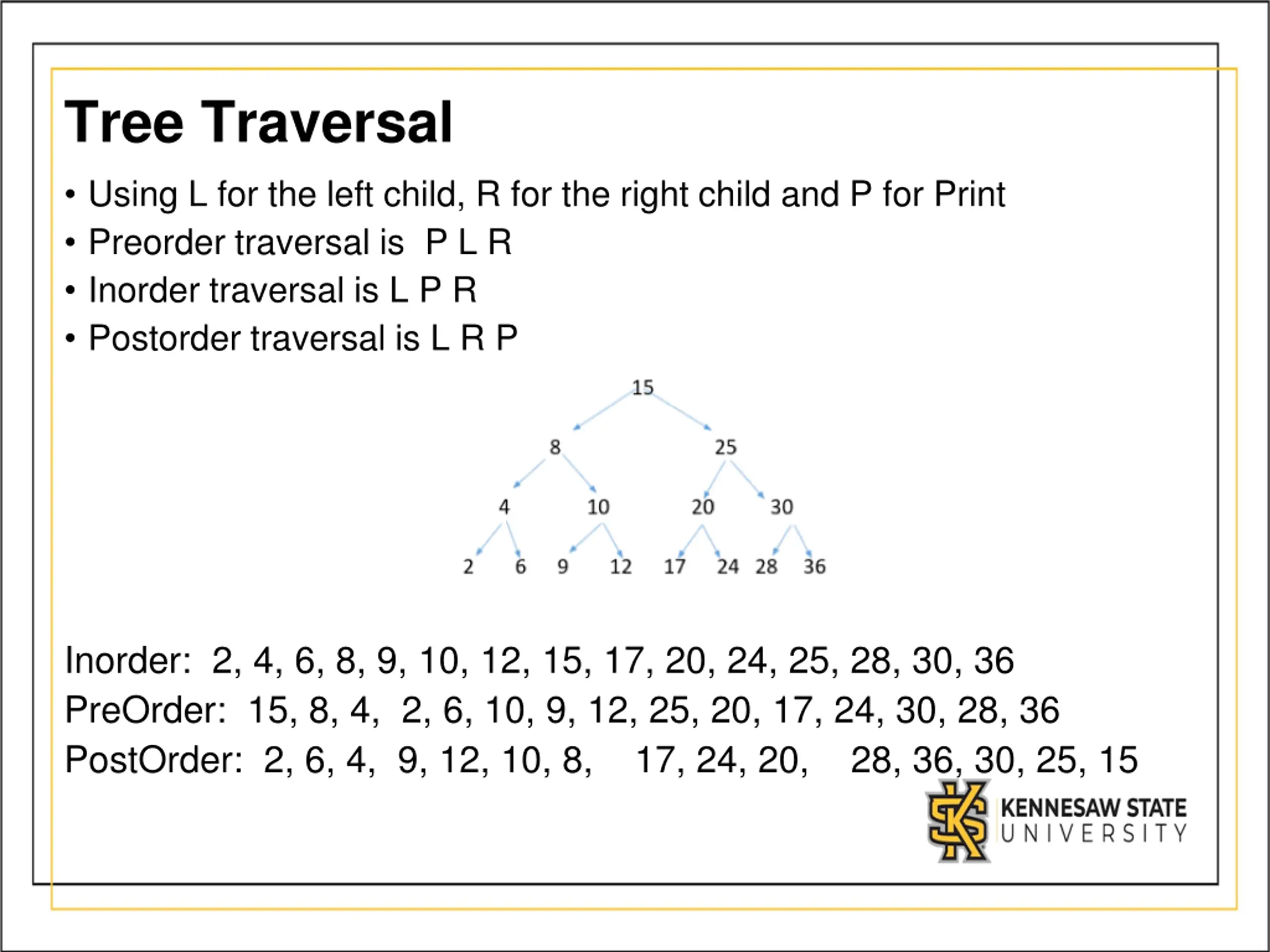 Tree Traversal Using L for the left child, R for the right child and P for Print Preorder traversal is P L R Inorder traversal is L P R Postorder traversal is L R P Inorder: 2, 4, 6, 8, 9, 10, 12, 15, 17, 20, 24, 25, 28, 30, 36 PreOrder: 15, 8, 4, 2, 6, 10, 9, 12, 25, 20, 17, 24, 30, 28, 36 PostOrder: 2, 6, 4, 9, 12, 10, 8, 17, 24, 20, 28, 36, 30, 25, 15