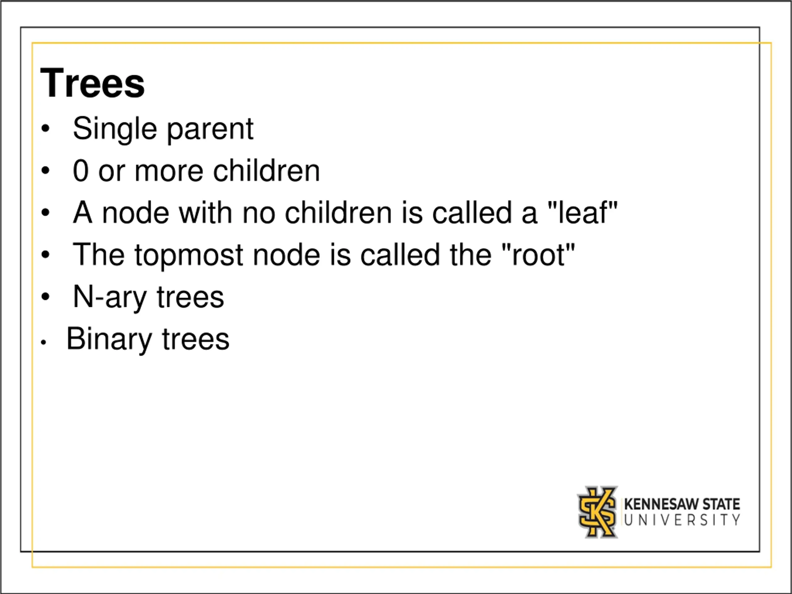 Trees Single parent 0 or more children A node with no children is called a "leaf" The topmost node is called the "root" N-ary trees Binary trees