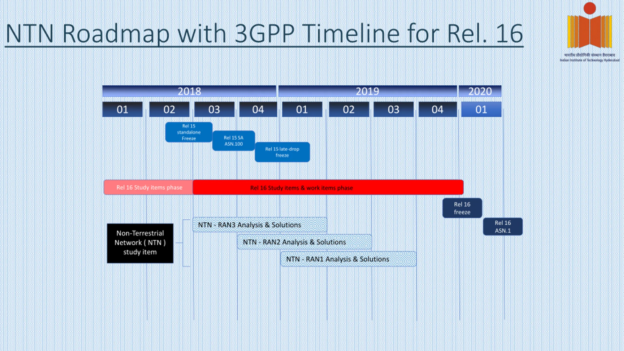 NTN Roadmap with 3GPP Timeline for Rel. 16 2018 2019 2020 01 02 03 04 01 02 03 04 01 Rel 15 standalone Freeze Rel 15 SA ASN.100 Rel 15 late-drop freeze Rel 16 Study items phase Rel 16 Study items & work items phase Rel 16 freeze Rel 16 ASN.1 NTN - RAN3 Analysis & Solutions Non-Terrestrial Network ( NTN ) study item NTN - RAN2 Analysis & Solutions NTN - RAN1 Analysis & Solutions