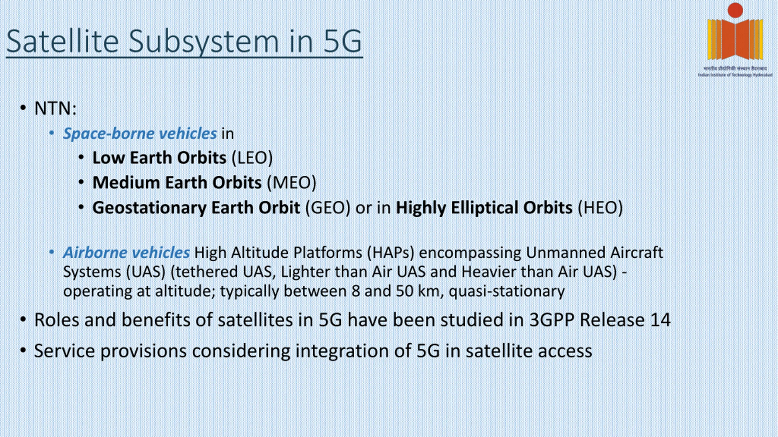 Satellite Subsystem in 5G NTN: Space-borne vehicles in Low Earth Orbits (LEO) Medium Earth Orbits (MEO) Geostationary Earth Orbit (GEO) or in Highly Elliptical Orbits (HEO) Airborne vehicles High Altitude Platforms (HAPs) encompassing Unmanned Aircraft Systems (UAS) (tethered UAS, Lighter than Air UAS and Heavier than Air UAS) - operating at altitude; typically between 8 and 50 km, quasi-stationary Roles and benefits of satellites in 5G have been studied in 3GPP Release 14 Service provisions considering integration of 5G in satellite access