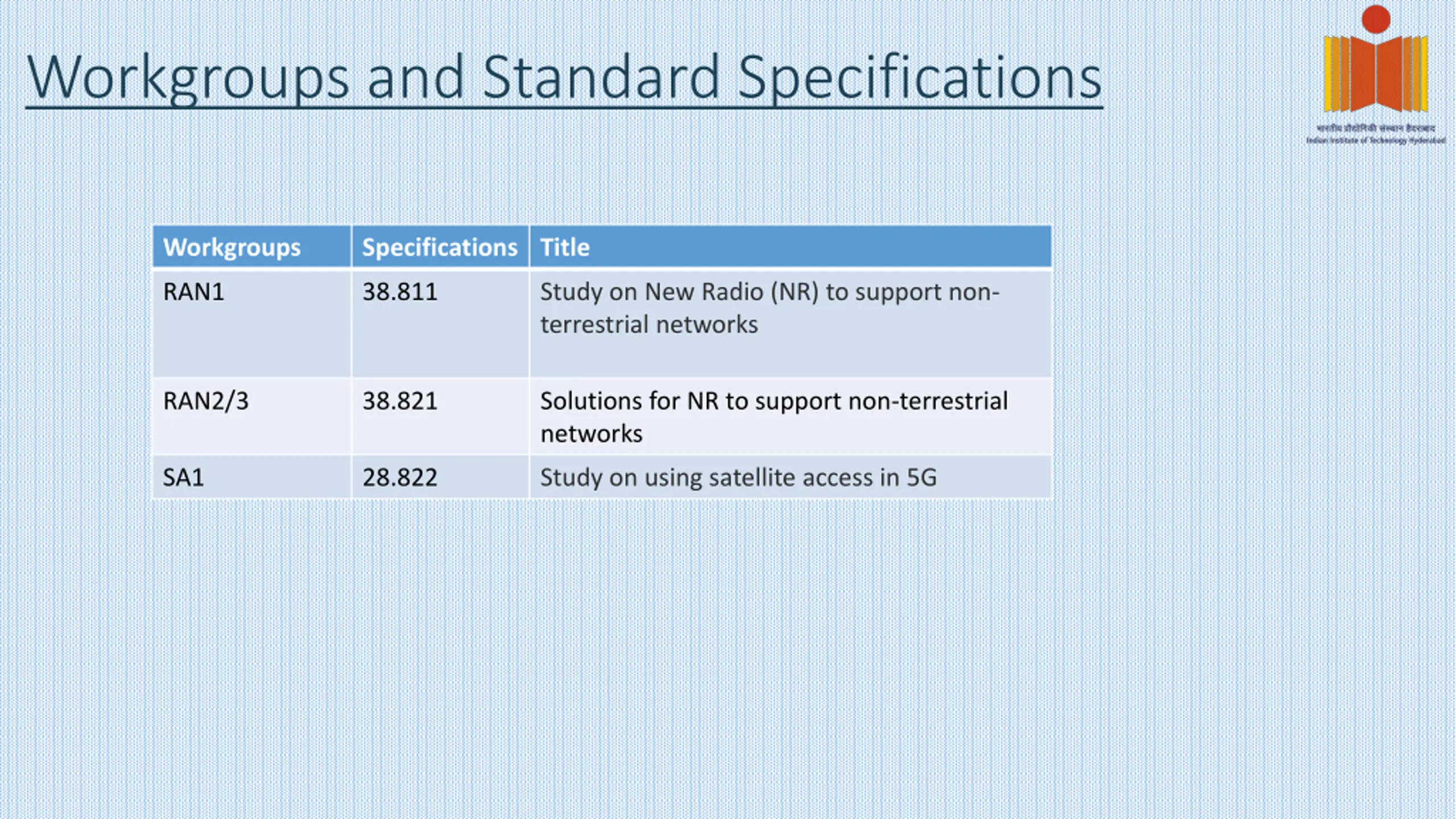 Workgroups and Standard Specifications Workgroups Specifications Title RAN1 38.811 Study on New Radio (NR) to support non- terrestrial networks RAN2/3 38.821 Solutions for NR to support non-terrestrial networks SA1 28.822 Study on using satellite access in 5G